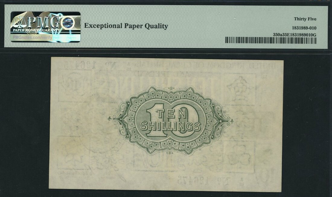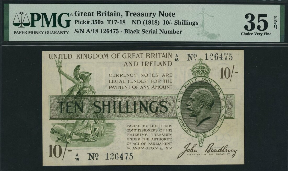 Treasury Series, John Bradbury, 10/- Shillings, ND (1918), serial number A/18 126475, (EPM T17), in PMG holder 35 EPQ Choice Very Fine