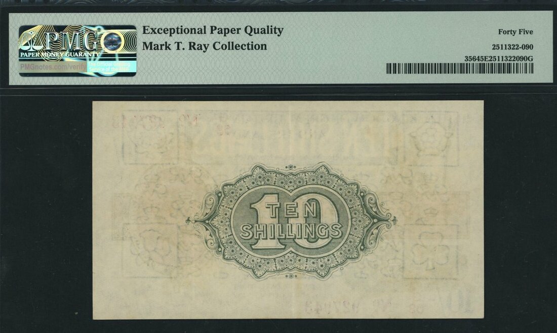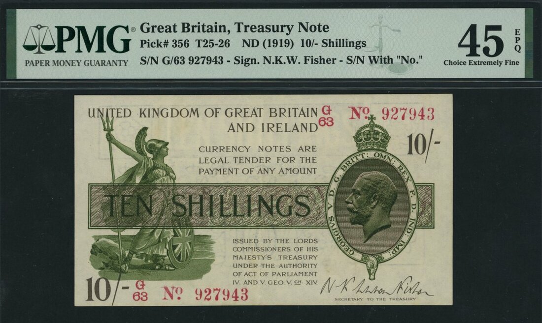 Treasury Series, N. F. W. Fisher, 10/- Shillings, ND (1919), serial number G/63 927943, (EPM T25), in PMG holder 45 EPQ Choice Extremely Fine, Ex Mark T. Ray Collection