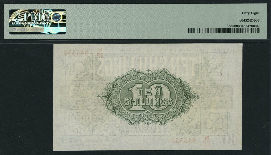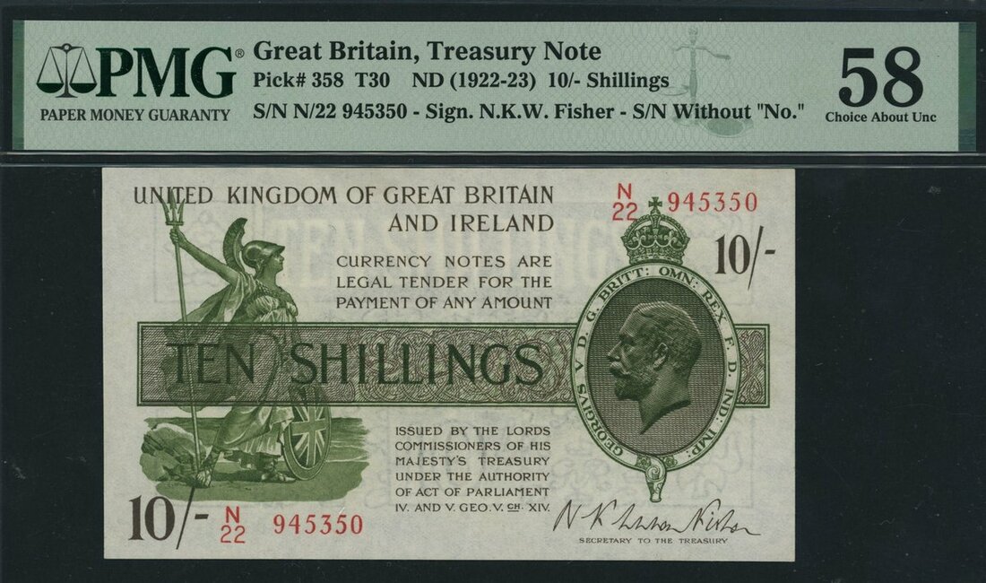 Treasury Series, N. F. W. Fisher, 10/- Shillings, ND (1922), serial number N/22 945350, (EPM T30), in PMG holder 58 Choice About Uncirculated