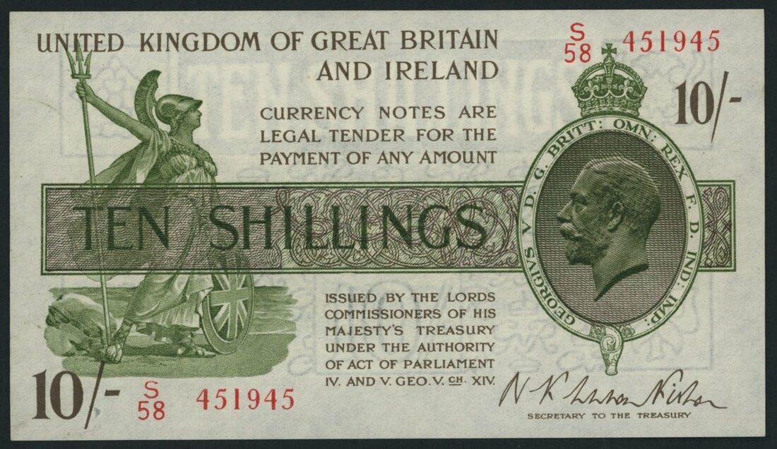 Treasury Series, N. F. W. Fisher, 10/- Shillings, ND (1922), last series serial number S/58 451945, (EPM T30), good extremely fine, some minor marks at lower left