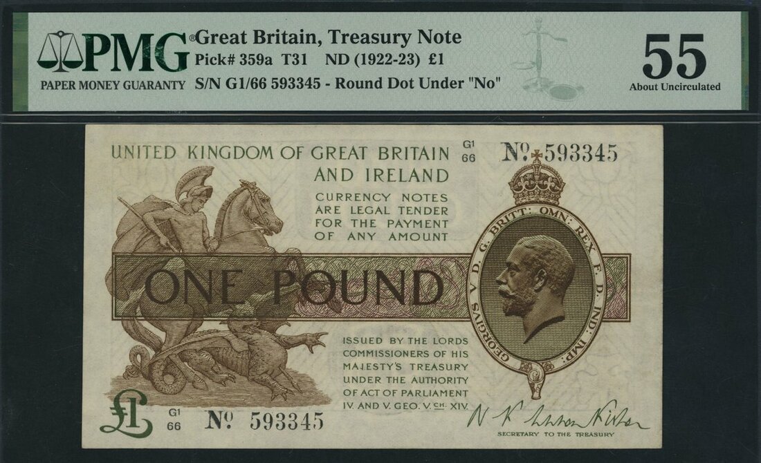 Treasury Series, N. F. W. Fisher, £1, ND (1923), serial number G1/66 593345, (EPM T31), in PMG holder 55 About Uncirculated