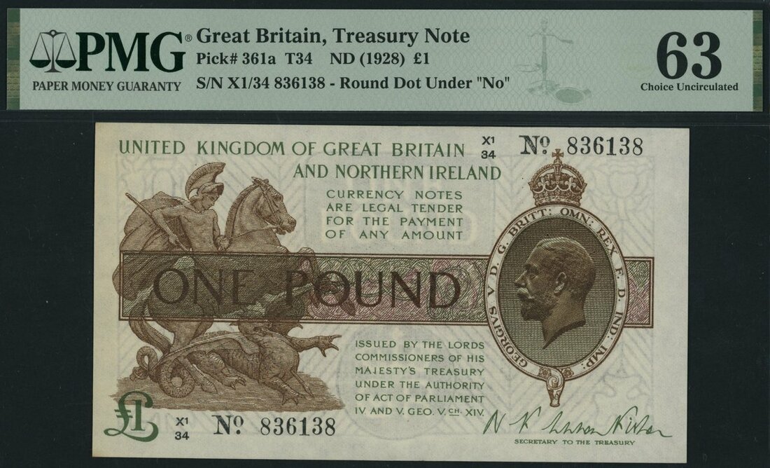 Treasury Series, N. F. W. Fisher, £1, ND (1927), last series serial number X1/34 836138, (EPM T34), in PMG holder 63 Choice Uncirculated, scarce in this grade