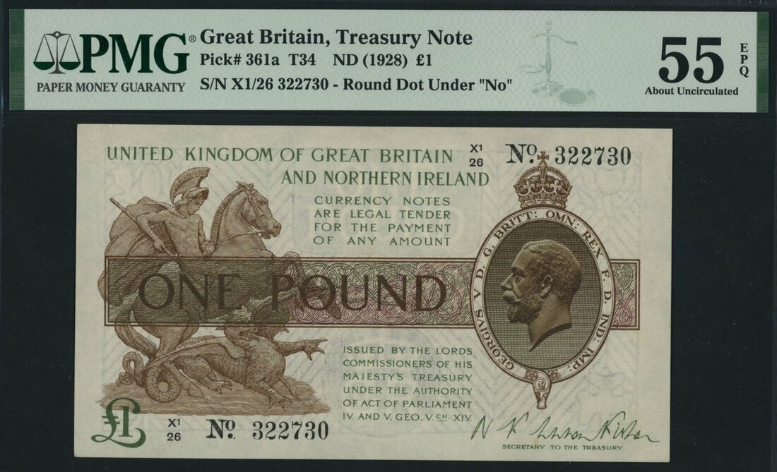 Treasury Series, N. F. W. Fisher, £1, ND (1927), last series serial number X1/26 322730, (EPM T34), in PMG holder 55 EPQ About Uncirculated