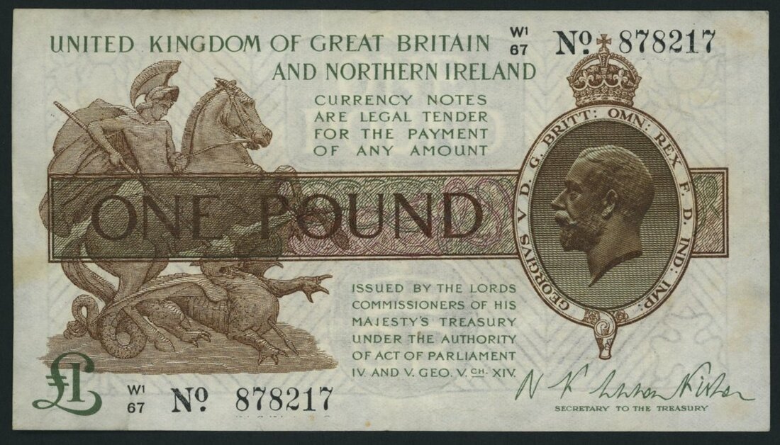 Treasury Series, N. F. W. Fisher, £1, ND (1928), last series serial number W1/67 878217, (EPM T35), very fine