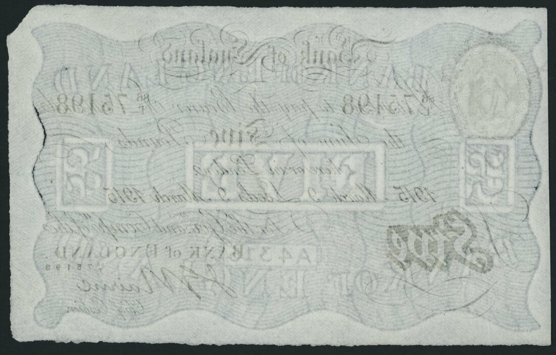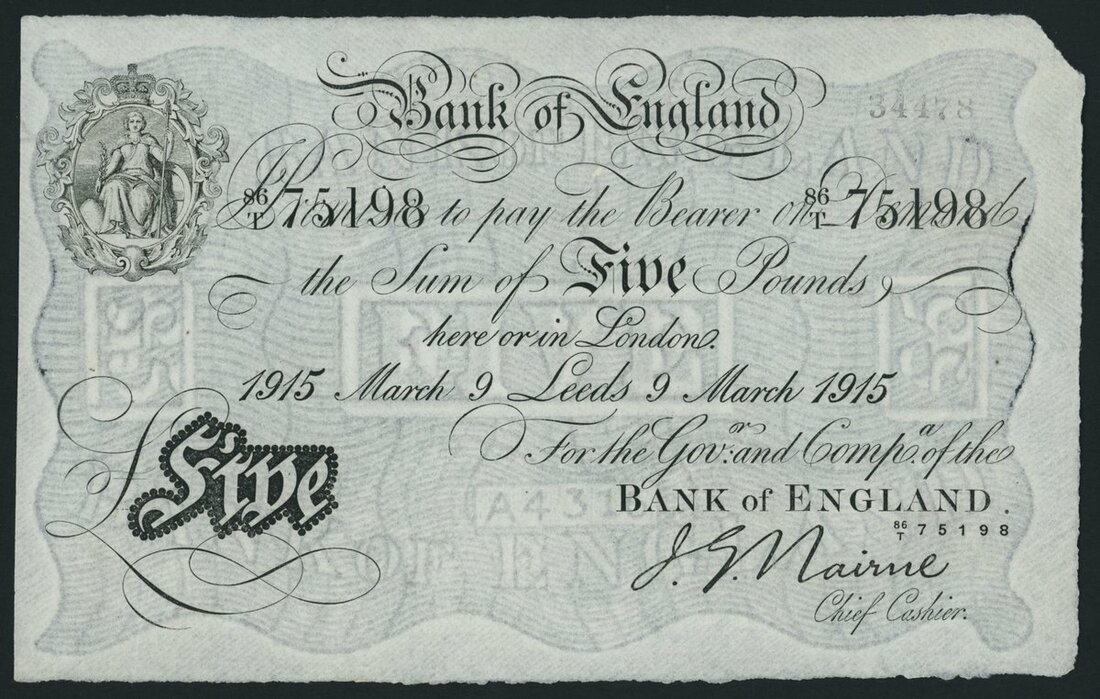 Bank of England, J. G. Nairne, £5, Leeds, 9th March 1915, serial number 86/T 75198, (EPM B208bd), paper maker's notch, two tears on either edge along the waved border of watermark, the right of which is more apparent, otherwise an attractive extremely fine and scarce as such,