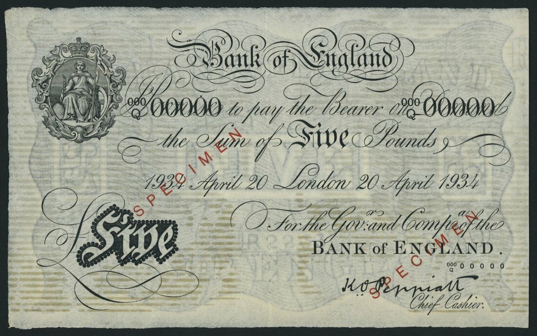 Bank of England, K. O. Peppiatt, specimen £5, London, 20th April 1934, serial number 000/Q 00000, (EPM B241s), very fine, scarce