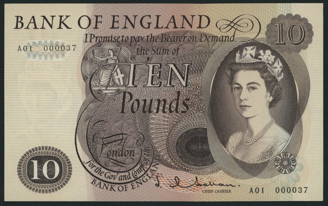 Bank of England, J. Q. Hollom, £10, 1964, low first run serial number A01 000037, (EPM B299), small stain on reverse otherwise good very fine