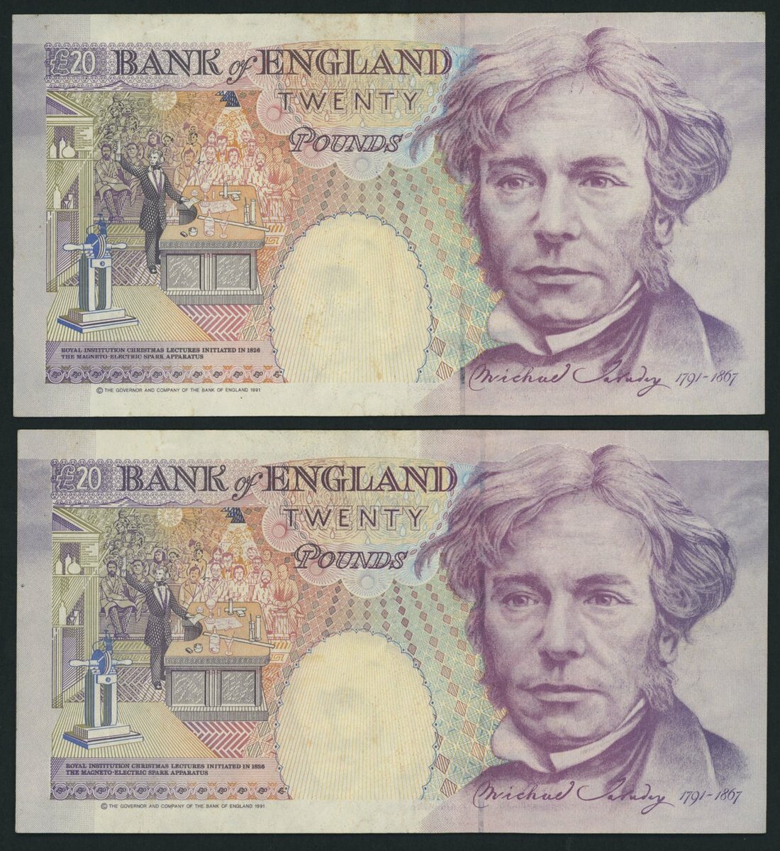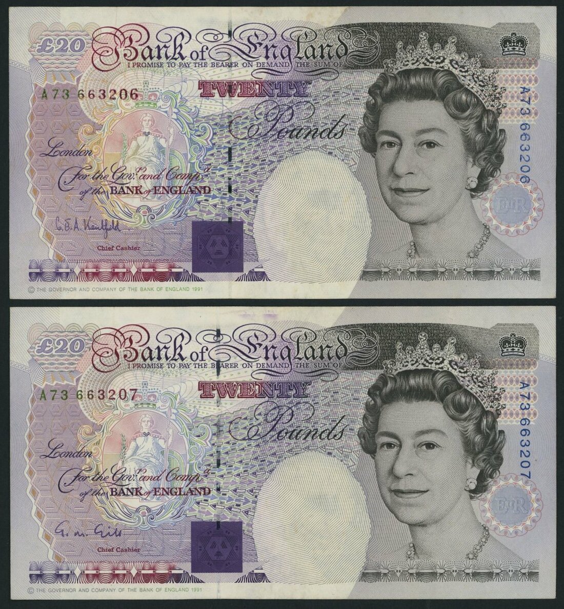 Bank of England, G. M. Gill & G. E. A. Kentfield, [2 notes] signature sequence pair £20, 1991 (1993), serial numbers A73 663206-07,