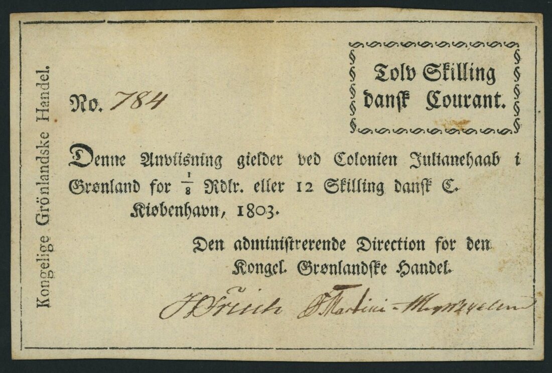 (x) Danish Administration, Greenland, 12 Skilling, 1803, serial number 784, Kongelige Gronlandske Handel,