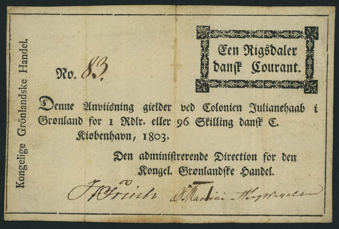 (x) Danish Administration, Greenland, 1 Rigsdaler, 1803, serial number 83, Kongelige Gronlandske Handel,