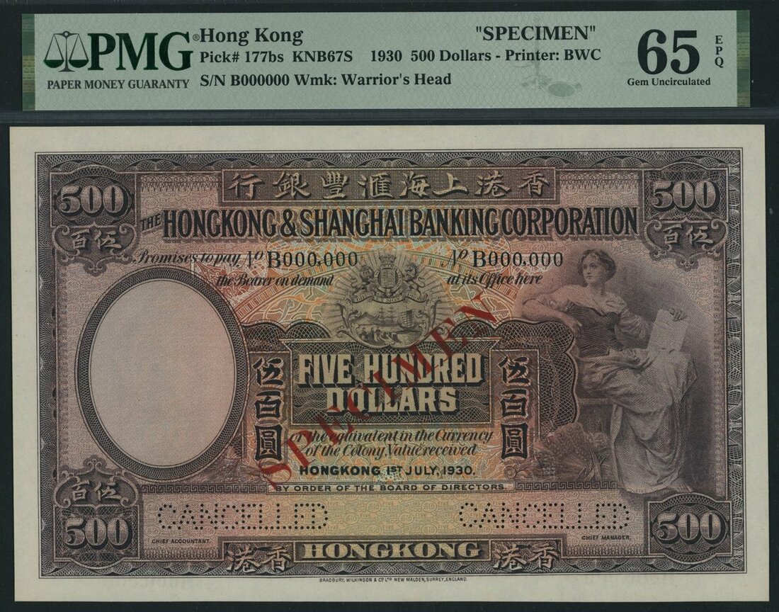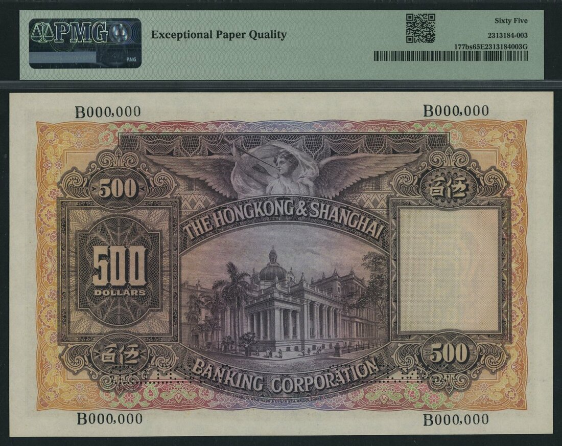 Hong Kong & Shanghai Banking Corporation, *TOP POP* specimen 500 Dollars, 1st July 1930, serial number B000,000, (Pick 177bs), in PMG holder 65 EPQ Gem Uncirculated, while there are two notes graded 66 EPQ and 67 EPQ under Pick 177s on the PMG population report, this note is the single finest graded on PMG's census for Pick 177bs. A beautiful example of the highest denomination specimen from this series