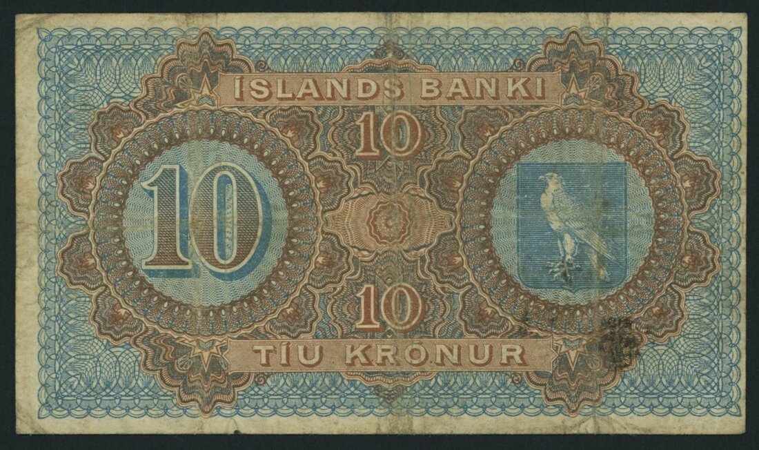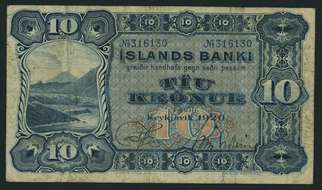 (x) Íslands Banki, Iceland, 10 Krónur, Reykjavik, 1920, serial number 316130, (Pick 16, BNB 507a), about fine, staining,