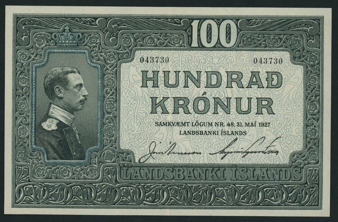 (x) Landsbanki Íslands, Iceland, 100 Krónur, 31st May 1927, serial number 43730, (Pick 26, BNB 604a), about extremely fine, light staining on reverse