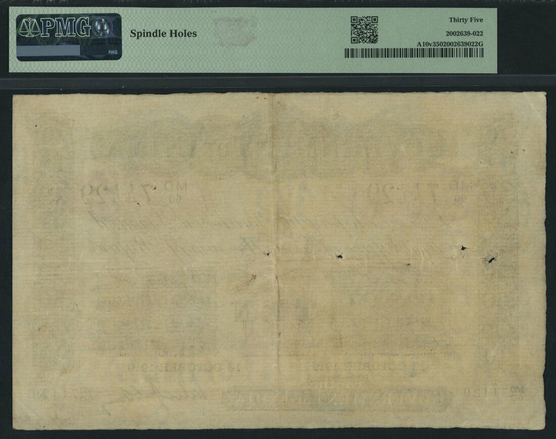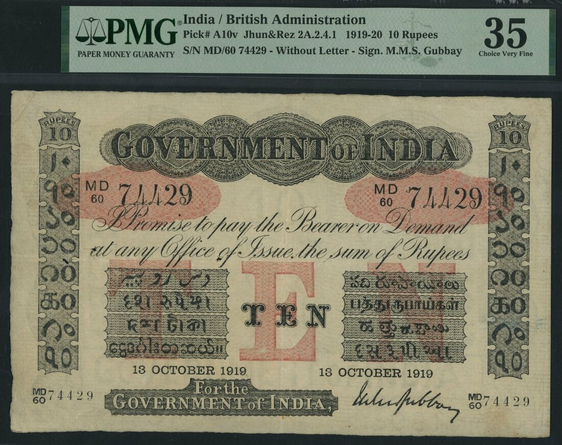 Government of India, 10 Rupees, 15th October 1919, serial number MD/60 74429, (Pick A10v), in PMG holder 35 Choice Very Fine, spindle holes