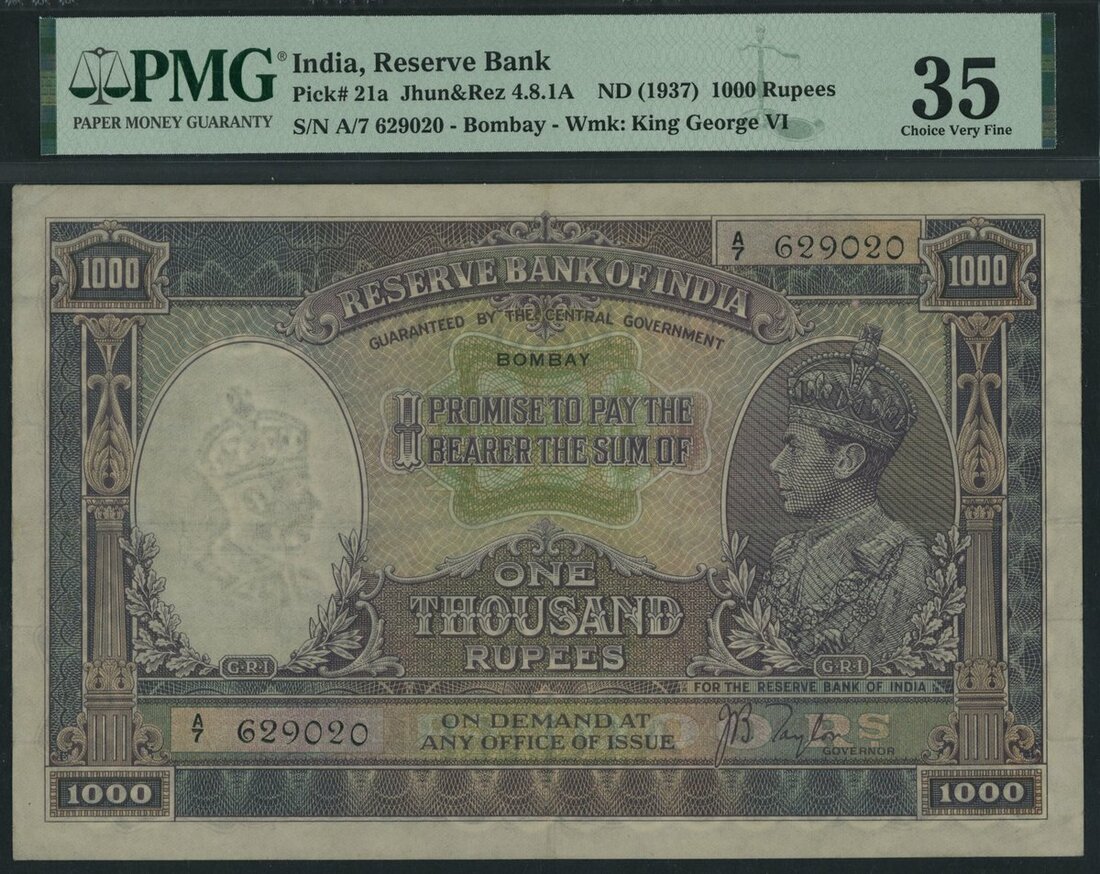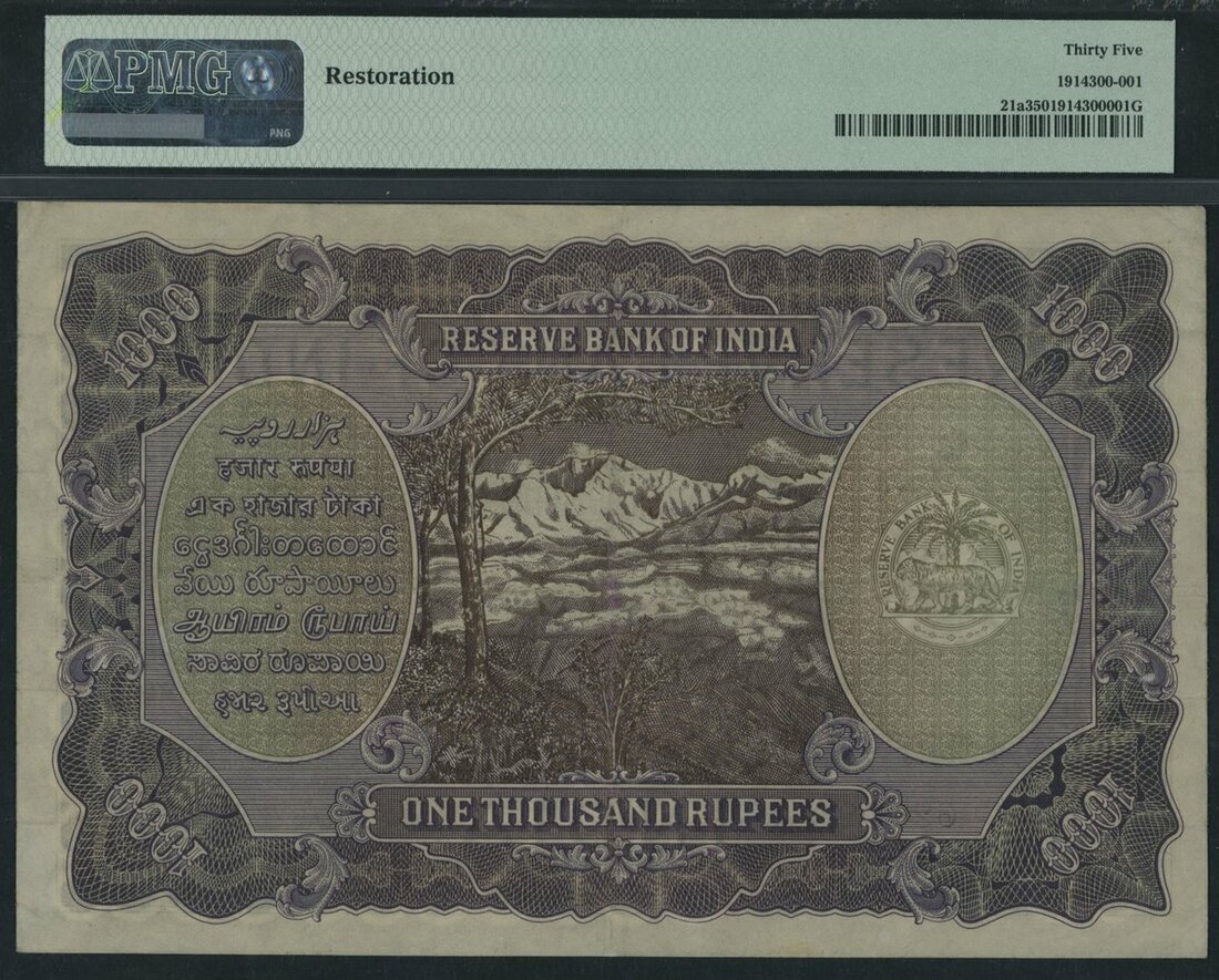 (x) Reserve Bank of India, 1000 Rupees, Bombay, ND (1937), serial number A/7 629020, (Pick 21a), in PMG holder 35 Choice Very Fine, restoration