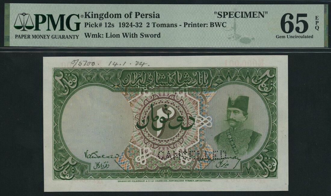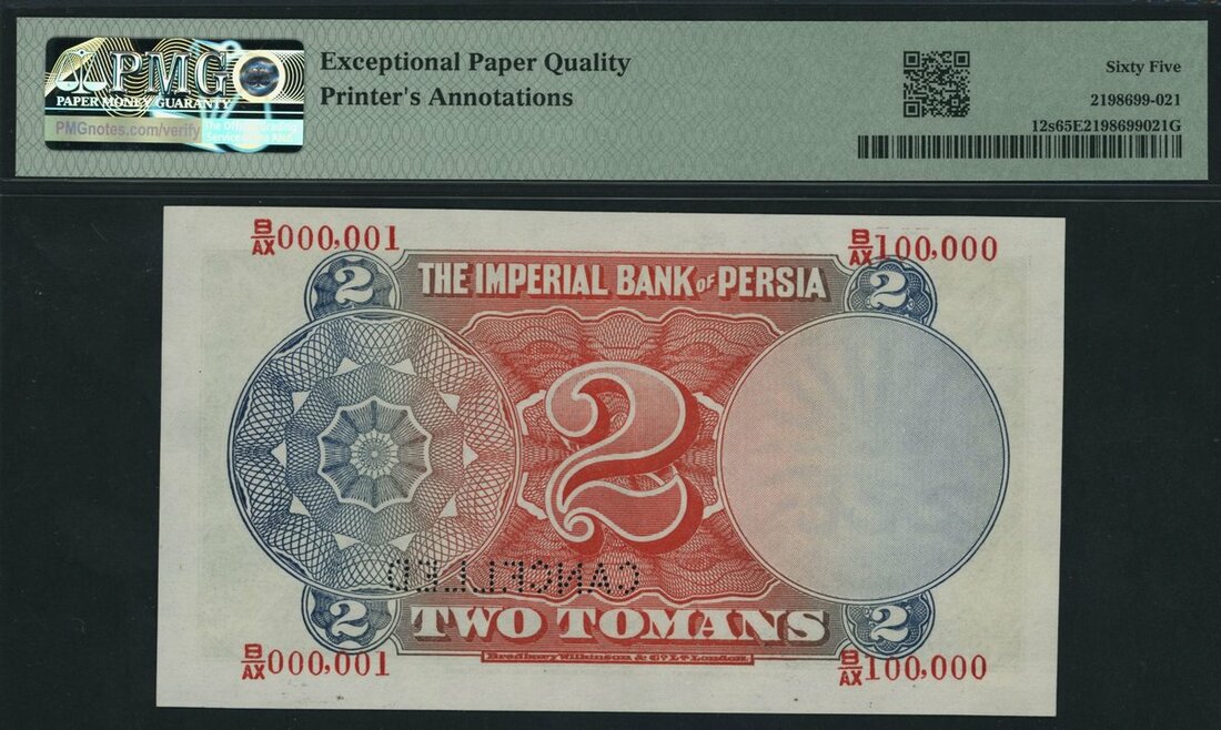 (x) Imperial Bank of Persia, *TOP POP* specimen 2 Tomans, 1924-32, serial number range B/AX 000001 - B/AX 100000, serial number with split double lower letters printed in red, pencil annotation dates this specimen 14th January 1924,