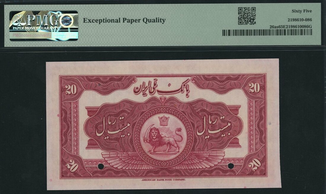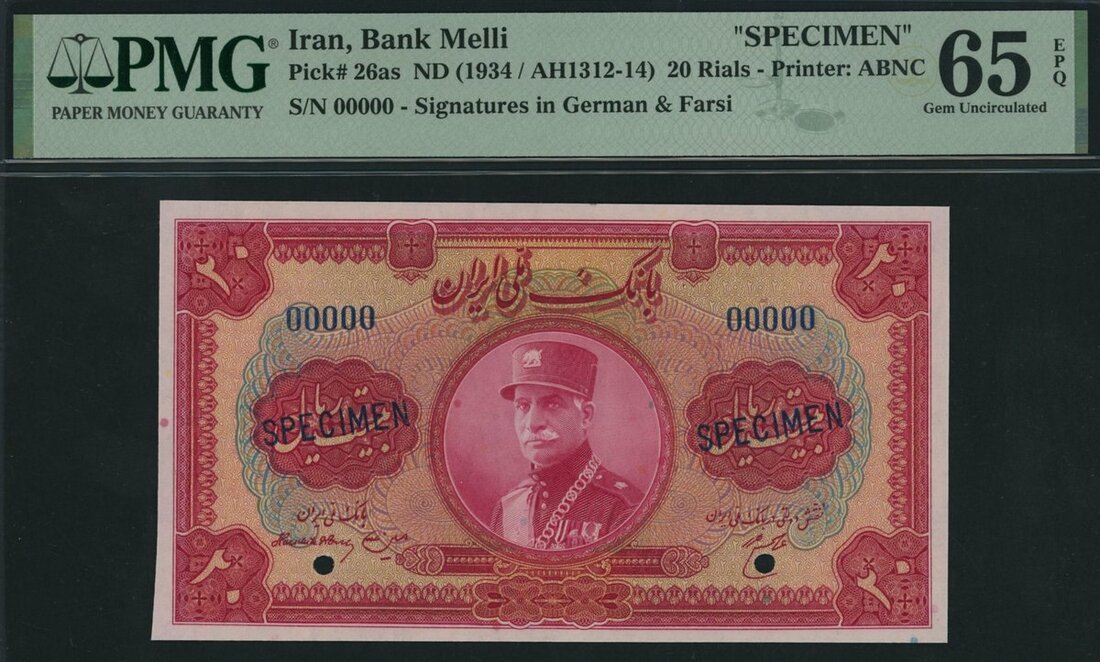 (x) Bank Melli, Iran, specimen 20 Rials, ND (1934), serial number 00000, signatures in German and Farsi,