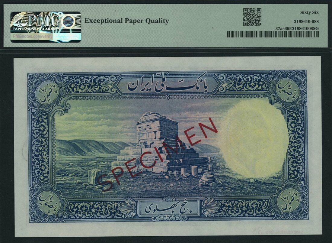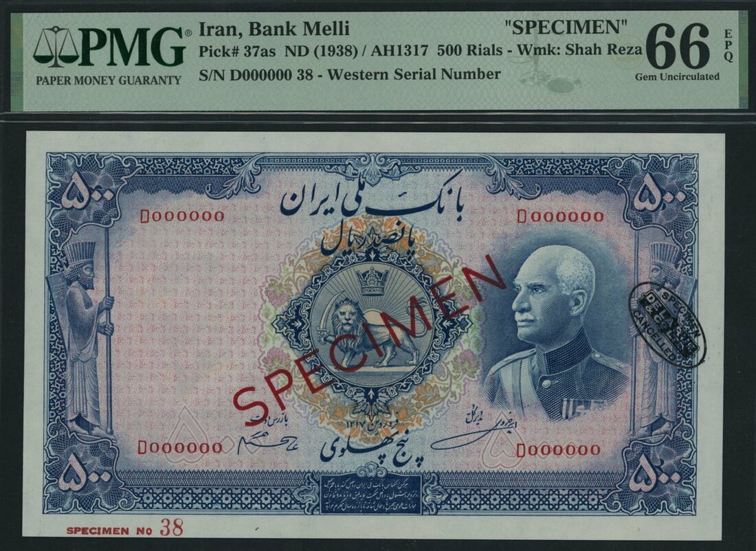 (x) Bank Melli, Iran, specimen 500 Rials, ND (1938), serial number D000000 38, (Pick 37as, BNB 131), in PMG holder 66 EPQ Gem Uncirculated, only 1 note in a higher grade on PMG census.
