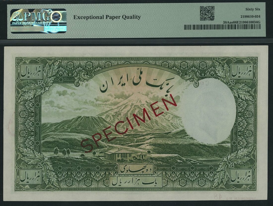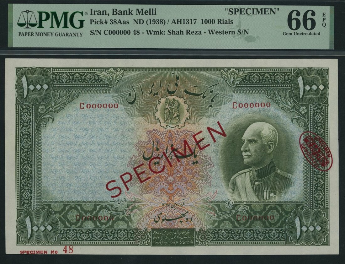 (x) Bank Melli, Iran, *TOP POP* specimen 1000 Rials, ND (1938), serial number C000000 48, (Pick 38Aas, BNB 132), in PMG holder 66 EPQ Gem Uncirculated, tied with two others for the finest graded on PMG census.