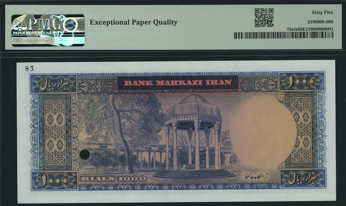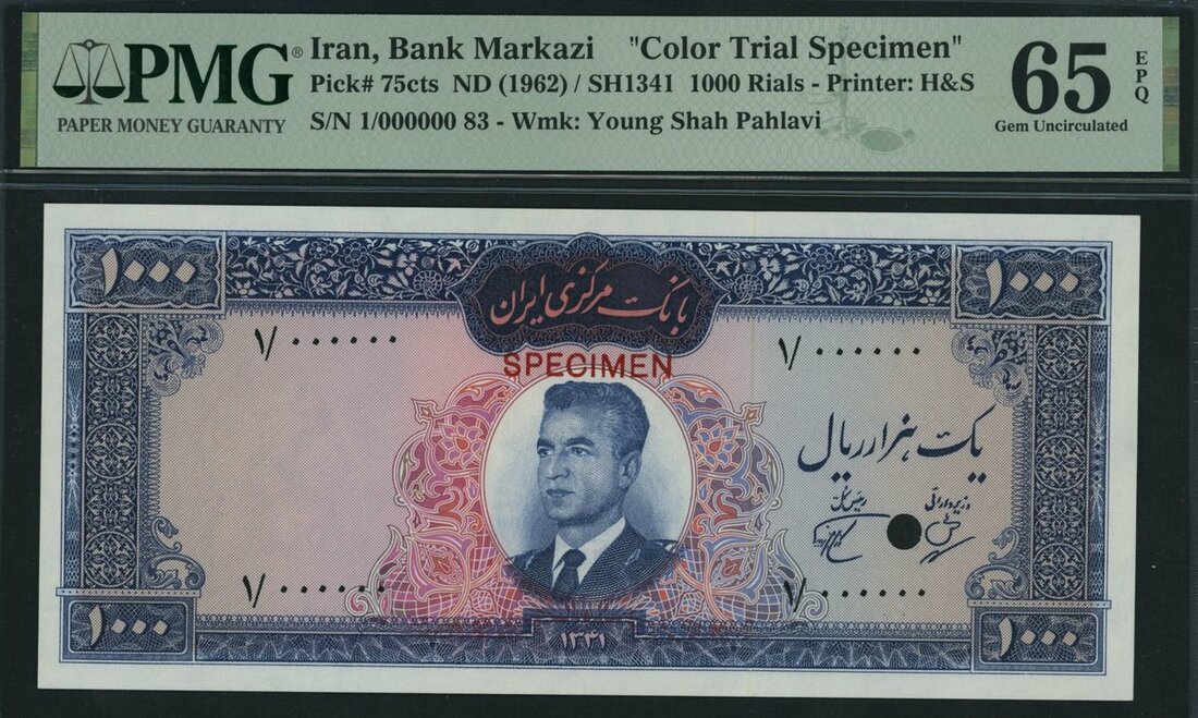 (x) Bank Markazi, Iran, colour trial specimen 1000 Rials, ND (1962), serial number 1/000000 83, (Pick 75cts, BNB 207), in PMG holder 65 EPQ Gem Uncirculated, only 5 notes in higher grades on PMG census.
