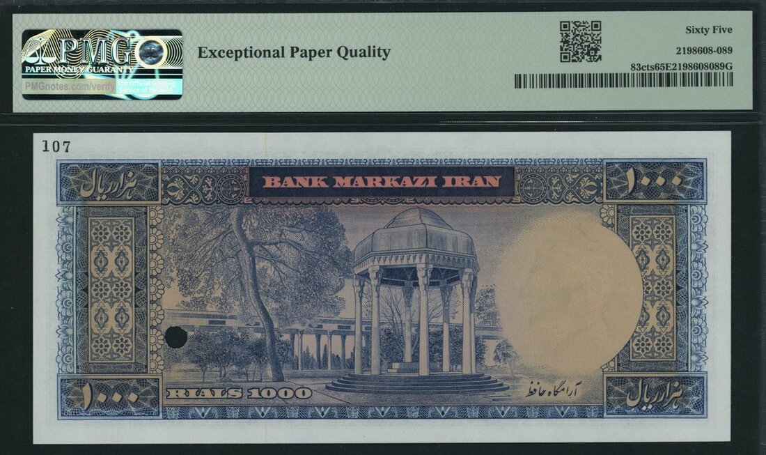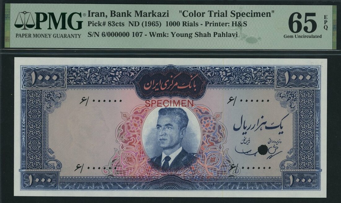 (x) Bank Markazi, Iran, colour trial specimen 1000 Rials, ND (1965), serial number 6/000000 107, (Pick 83cts, BNB 213), in PMG holder 65 EPQ Gem Uncirculated, scarce, only 4 notes in higher grades on PMG census.