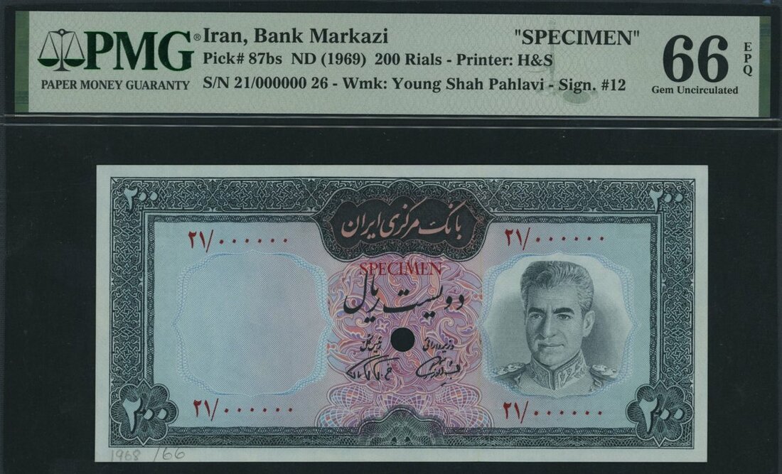 (x) Bank Markazi, Iran, colour trial specimen 200 Rials, ND (1969), serial number 21/000000 26, (Pick 87bs, BNB 217), in PMG holder 66 EPQ Gem Uncirculated, printer's annotations, only 1 note in a higher grade on PMG census.