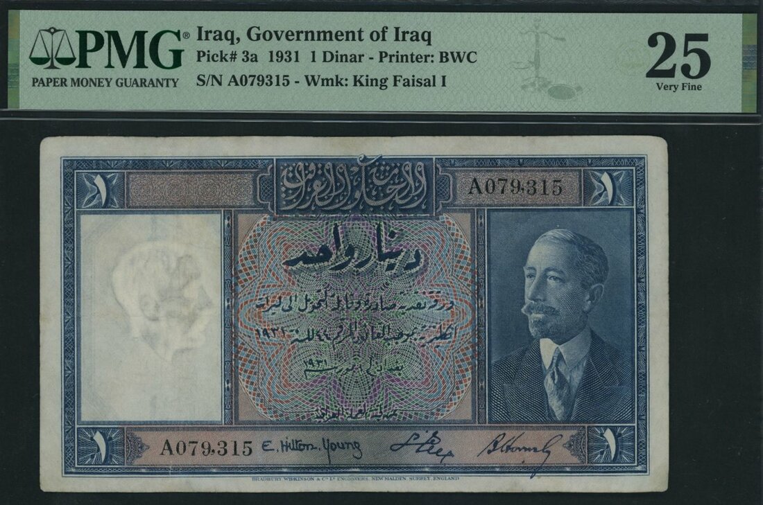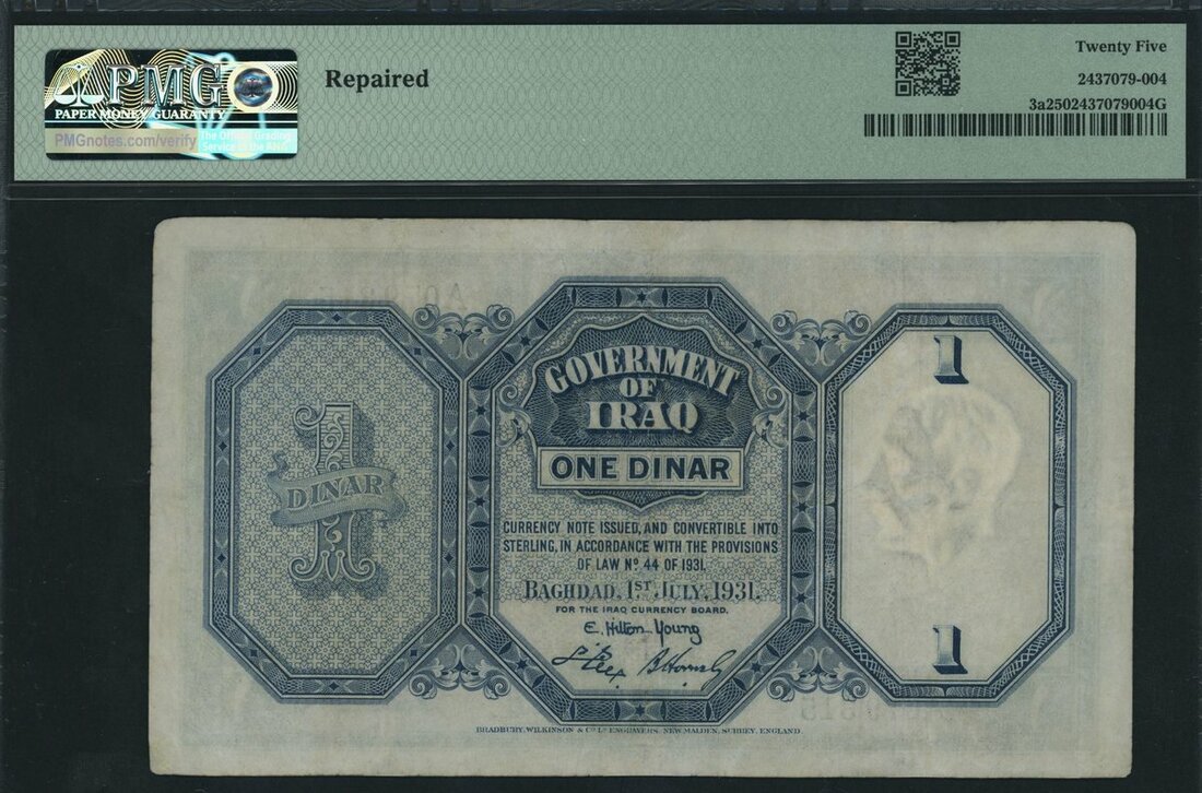 Government of Iraq, 1 Dinar, 1931, serial number A079,315, (Pick 3a), in PMG holder 25 Very Fine, repaired