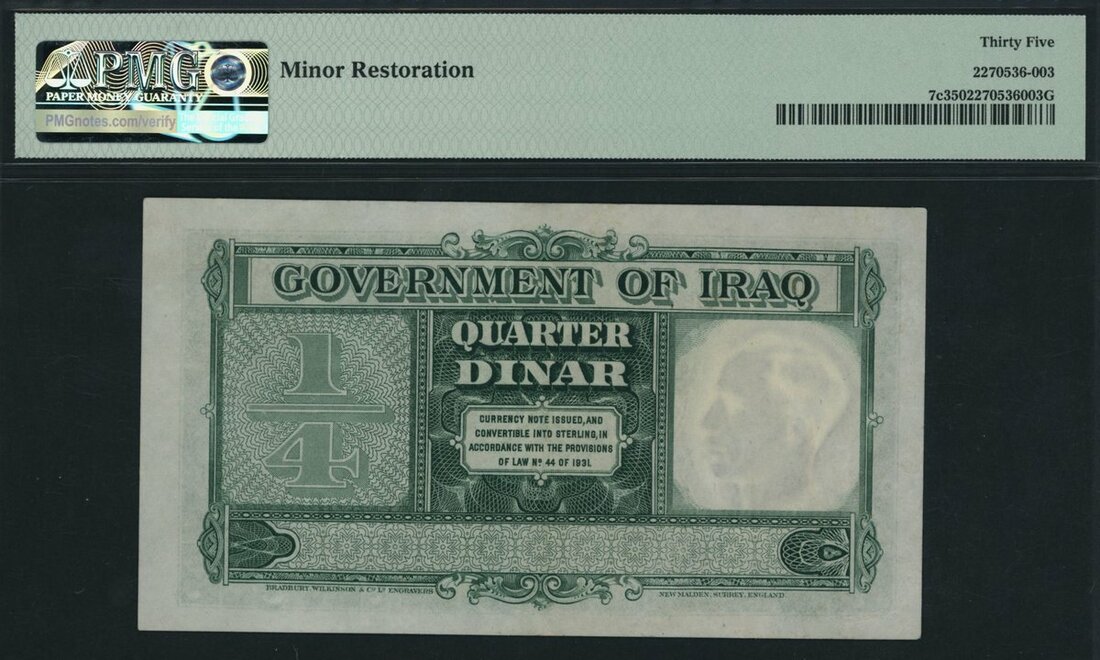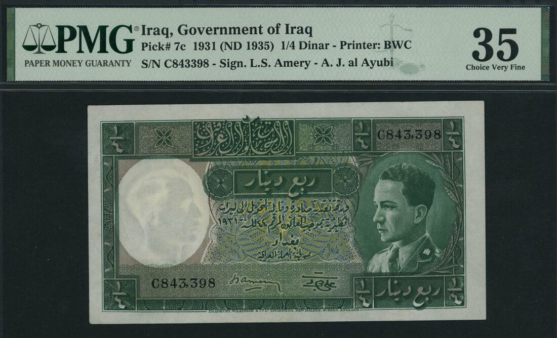 Government of Iraq, 1/4 Dinar, 1931 (ND 1935), serial number C843,398, (Pick 7c), in PMG holder 35 Choice Very Fine, minor restoration, only 4 notes in higher grades on PMG census