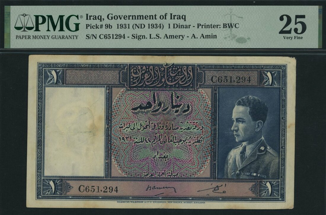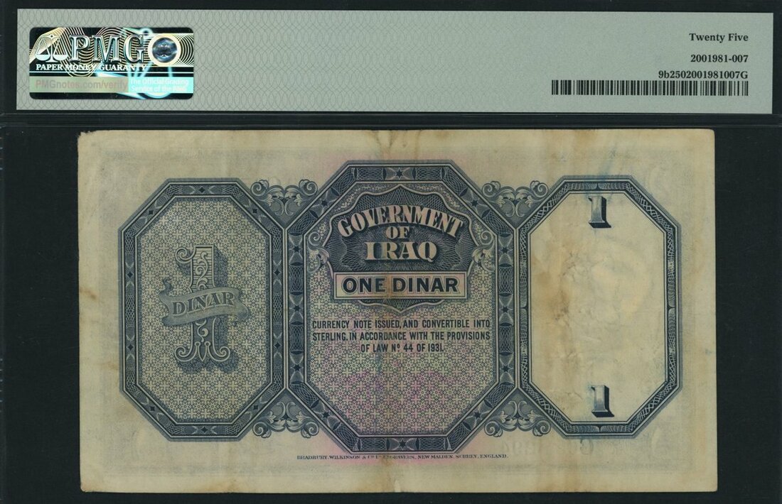Government of Iraq, 1 Dinar, 1931 (ND 1934), serial number C651,294, (Pick 9b), in PMG holder 25 Very Fine, only 5 notes in higher grades on PMG census