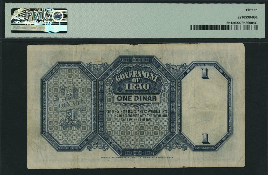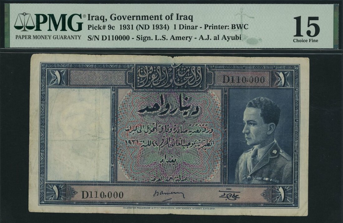 Government of Iraq, 1 Dinar, 1931 (ND 1934), rare binary serial number D110,000, (Pick 9c), in PMG holder 15 Choice Fine, extremely unusual and appealing binary serial number, and more so without any repairs