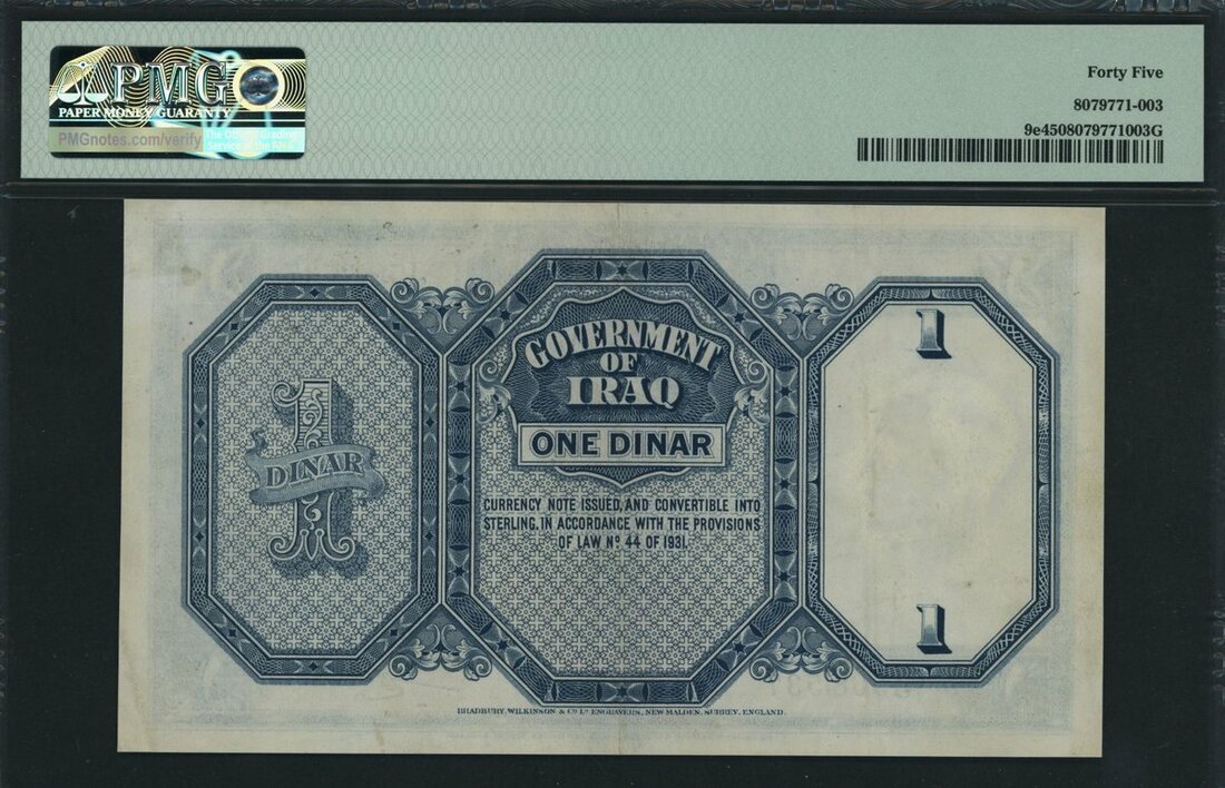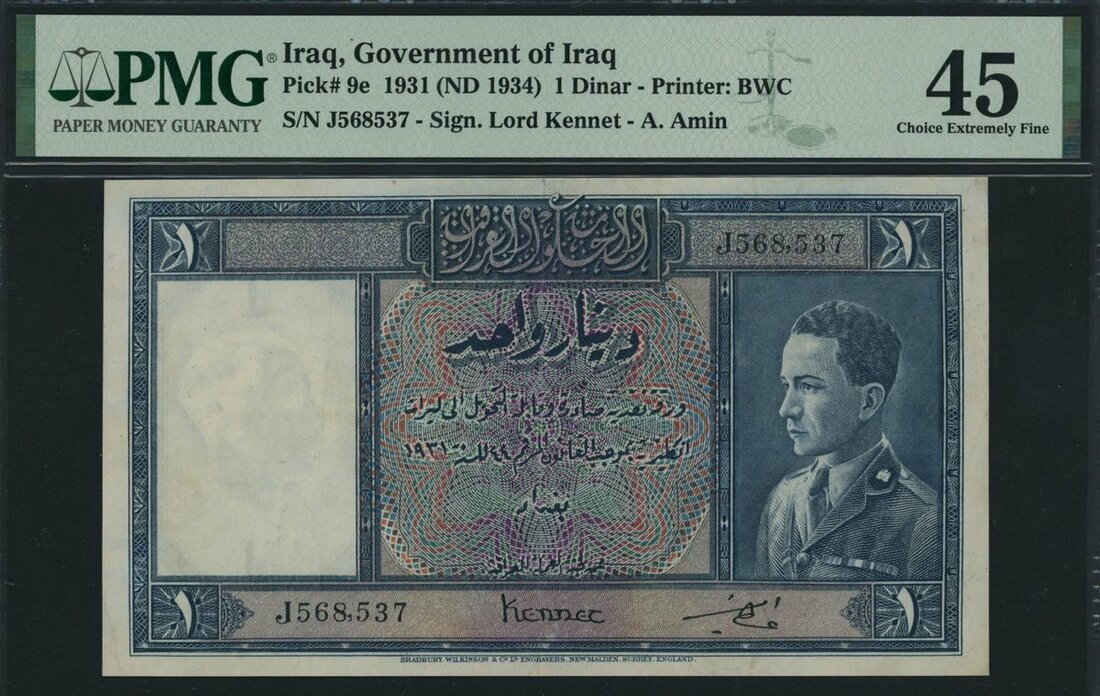 Government of Iraq, 1 Dinar, 1931 (ND 1934), serial number J568,537, (Pick 9e), in PMG holder 45 Choice Extremely Fine, only 6 notes in higher grades on PMG census