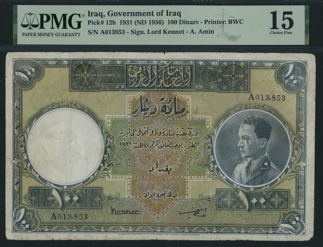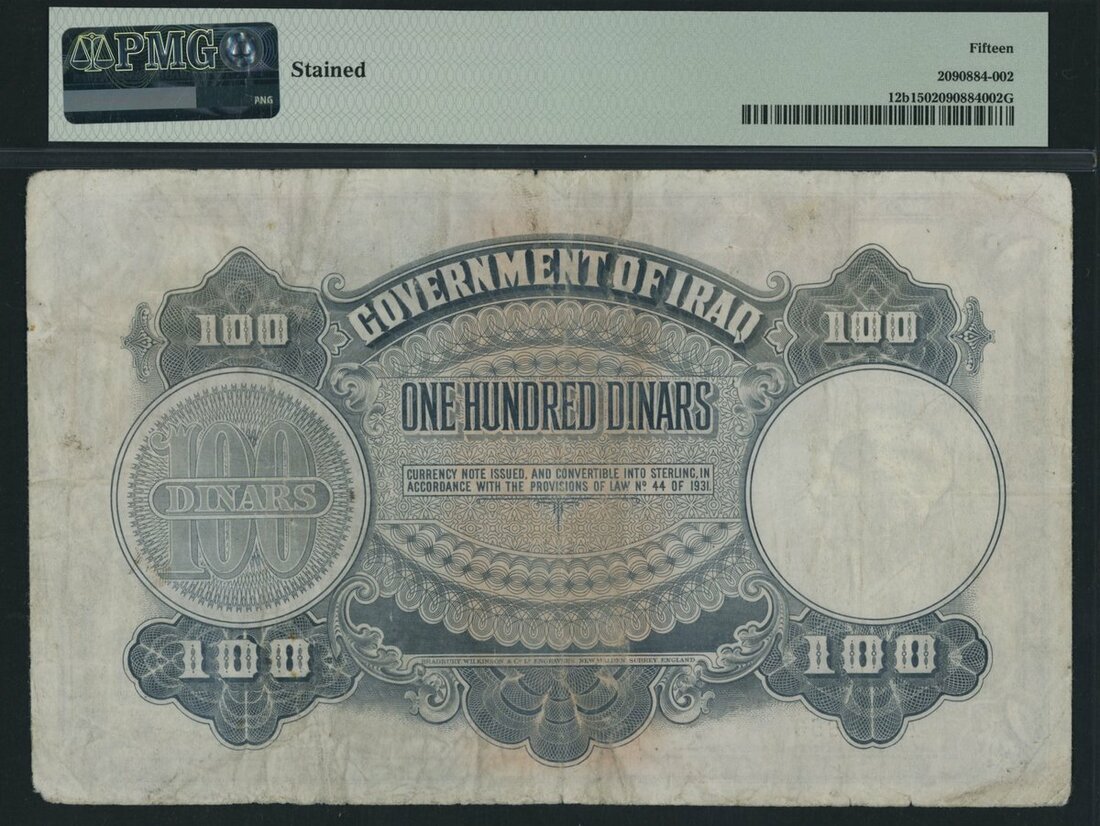 Government of Iraq, 100 Dinars, 1931 (ND 1936), serial number A013,853, (Pick 12b), in PMG holder 15 Choice Fine, stained, only 4 notes in higher grades on PMG census, with just a handful of examples ever offered publicly, stunningly rare