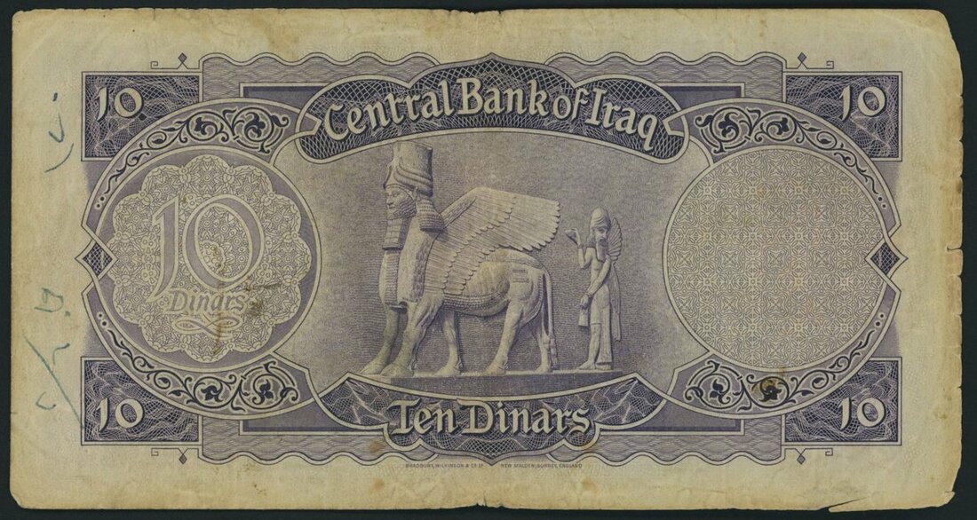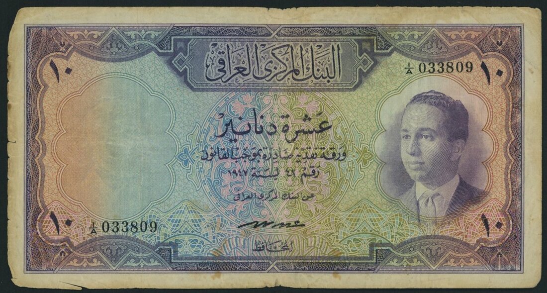 (x) Central Bank of Iraq, 10 Dinars, ND (1959), serial number 1/A 033809, (Pick 50), fine, staining, tears