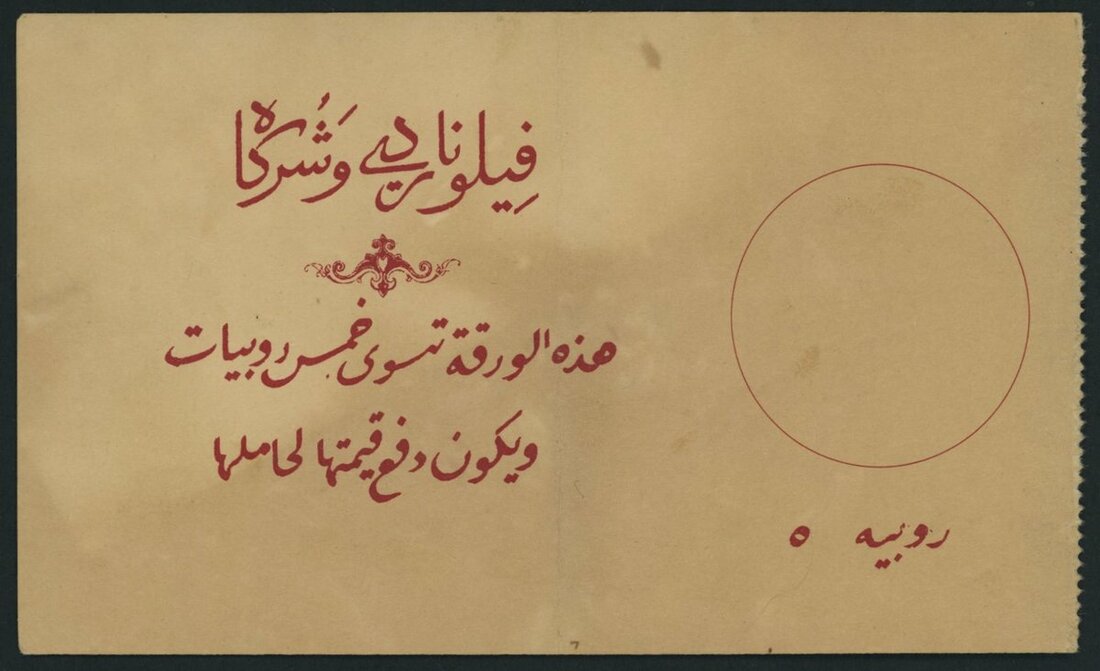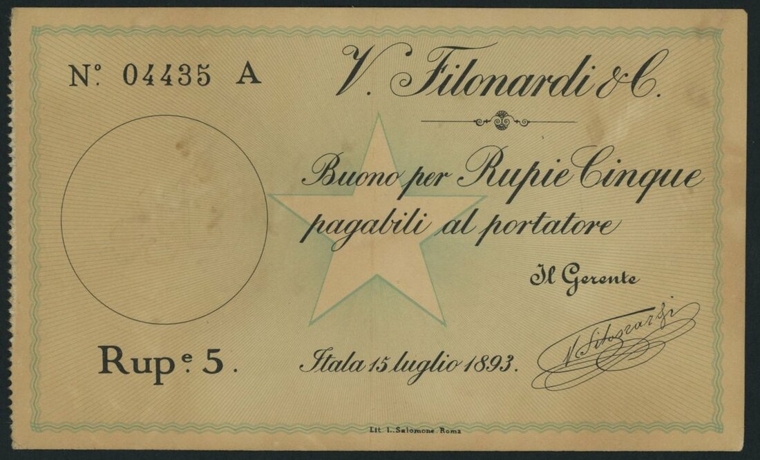 (x) V. Filonardi & Co., Italian Somaliland, 5 Rupias, 15th July 1893, serial number 04435, (Pick 1), about extremely fine, one vertical crease through centre, scarce