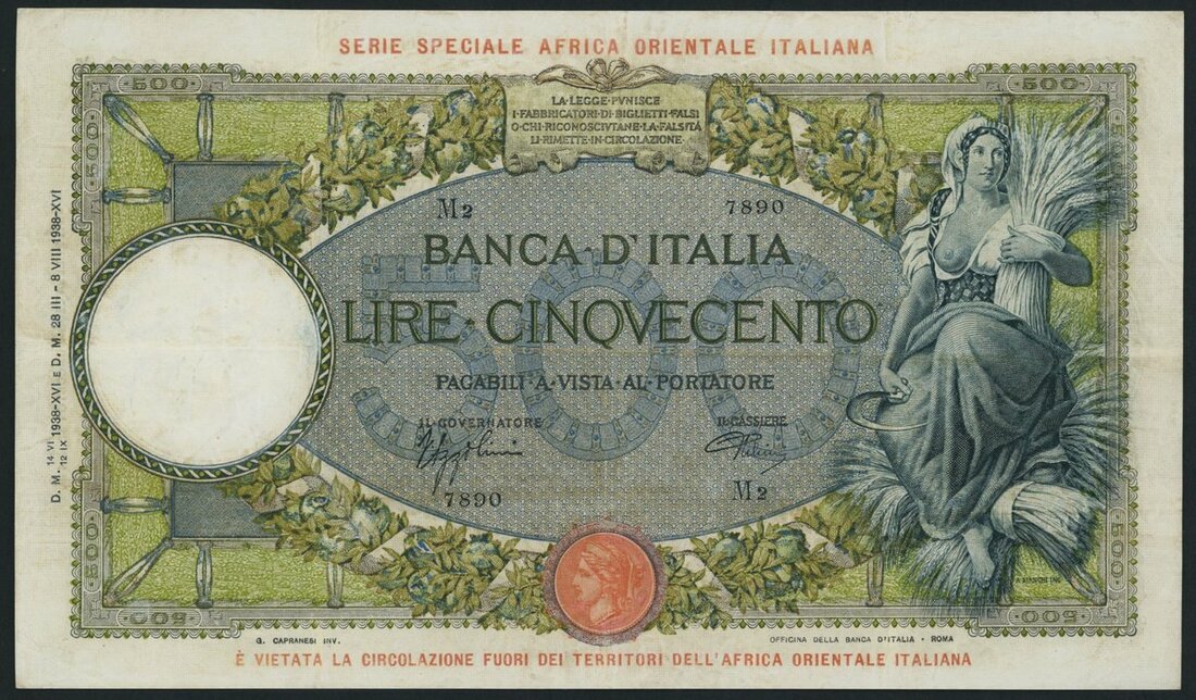 (x) Banca d'Italia, Italian East Africa, 500 Lire, 1938, serial number M2 7890, (Pick 3a), an appealing good very fine, scarce