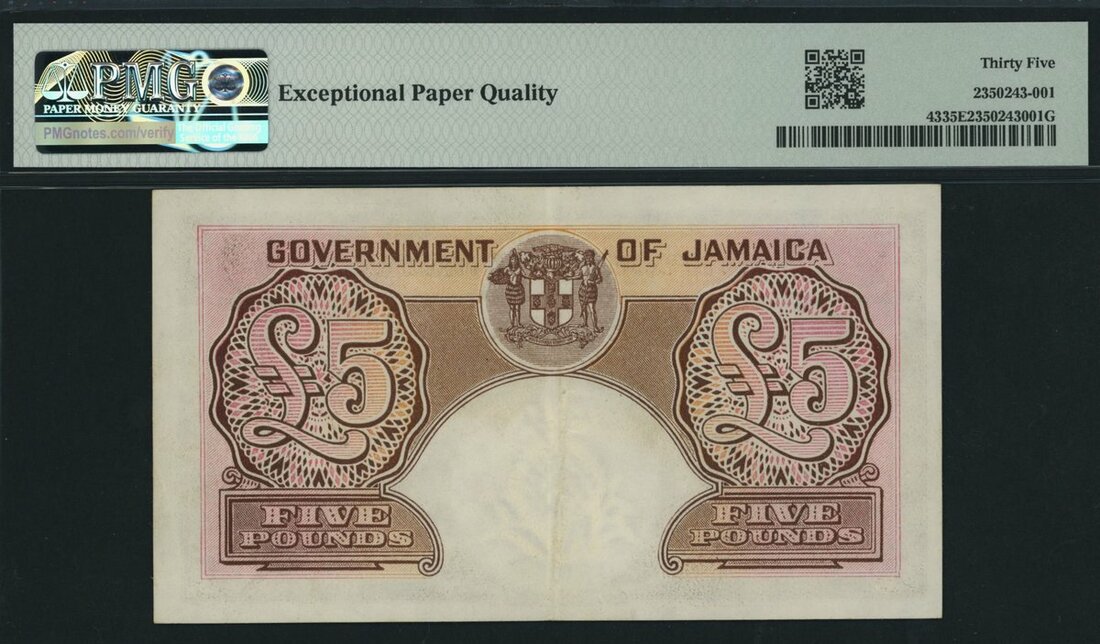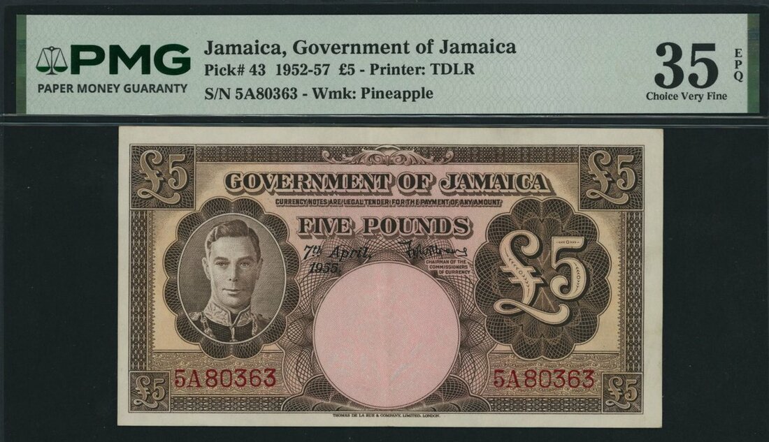 Government of Jamaica, £5, 7th April 1955, serial number 5A80363, (Pick 43), in PMG holder 35 EPQ Choice Very Fine