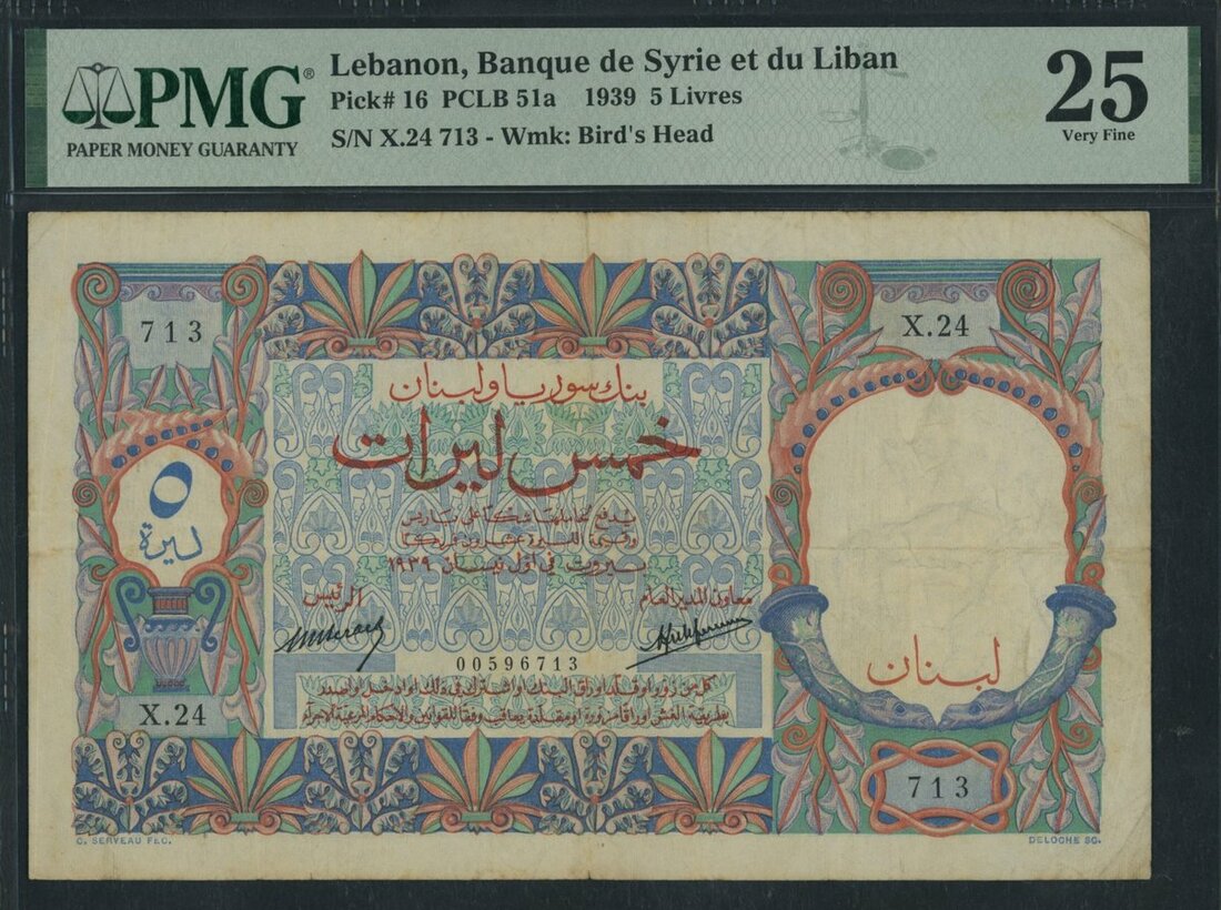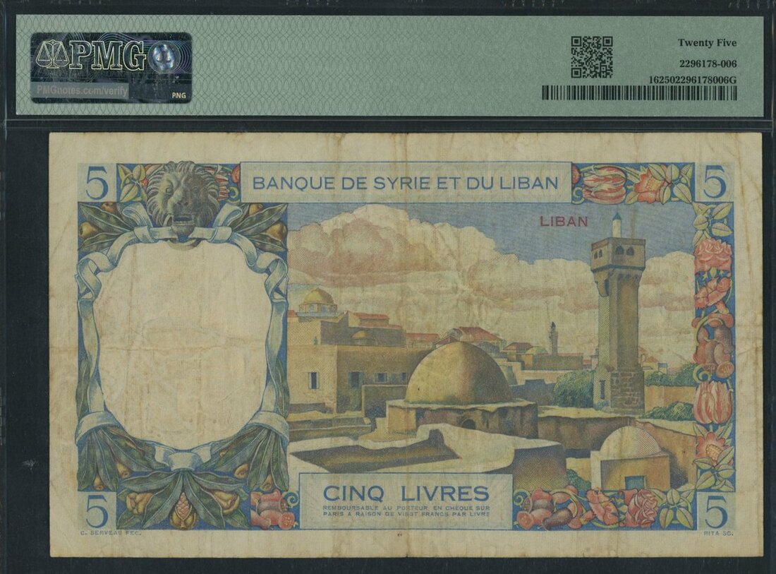 Banque de Syrie et du Liban, Lebanon, 5 Livres, 1939, serial number X.24 713, (Pick 16), in PMG holder 25 Very Fine