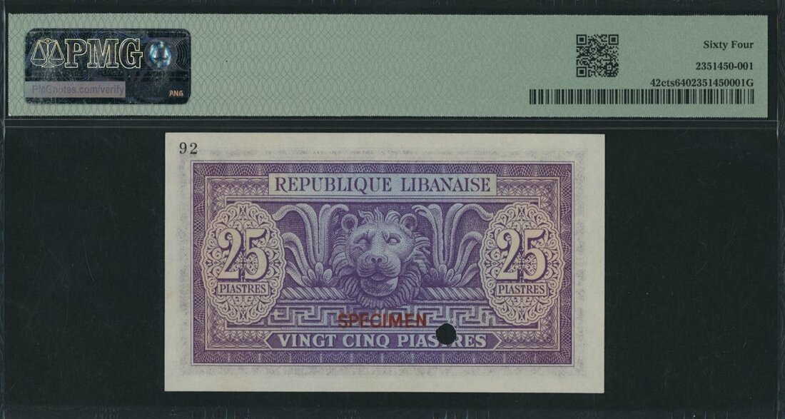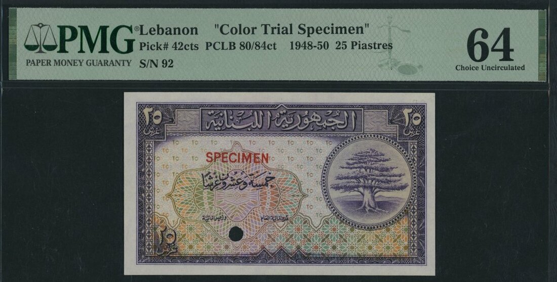 (x) République Libanaise, Lebanon, colour trial specimen 25 Piastres, ND (1948-50), specimen number 92, (Pick 42cts), in PMG holder 64 Choice Uncirculated