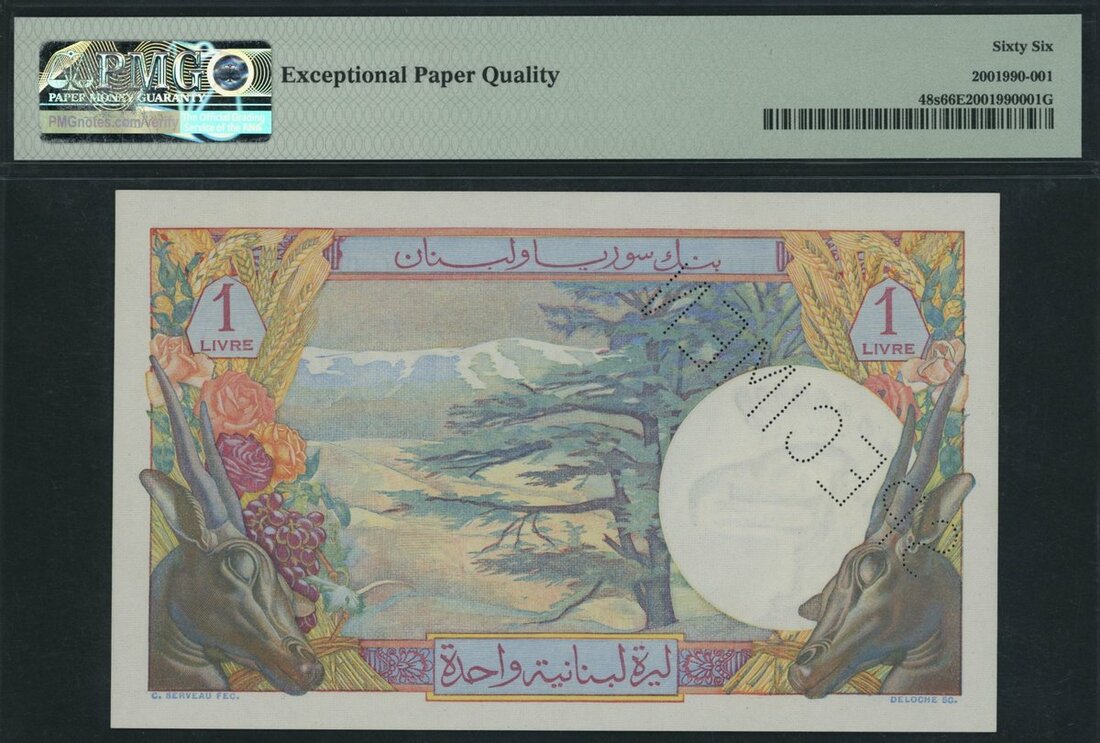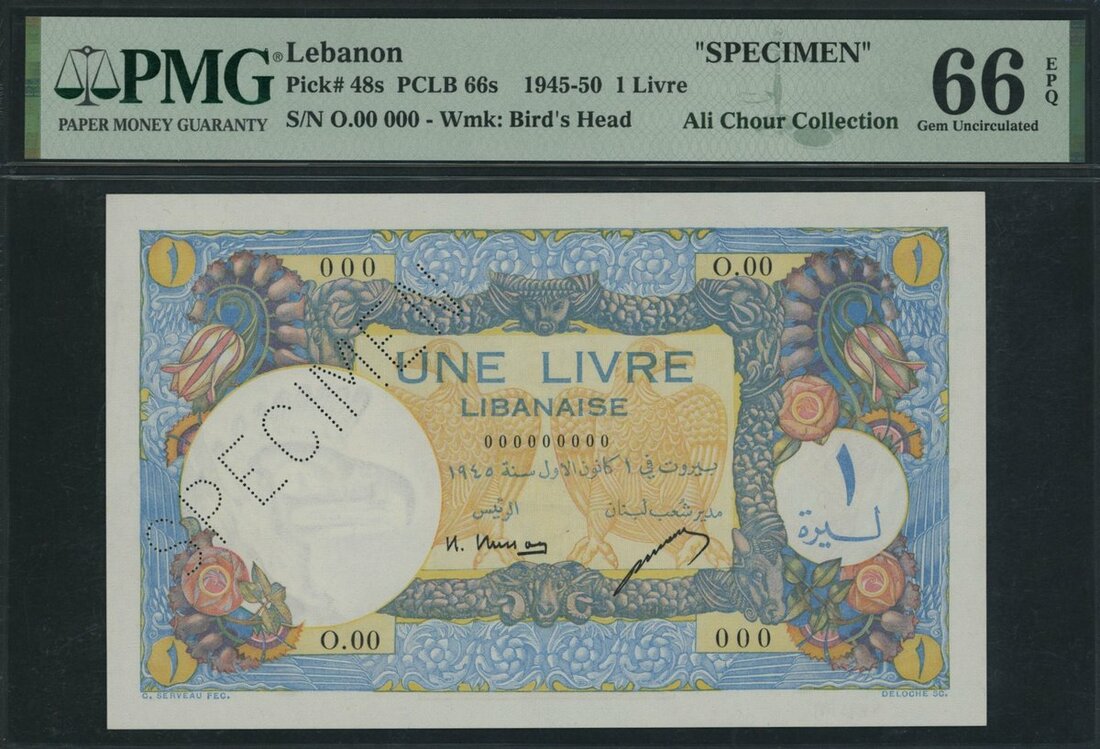 (x) Banque de Syrie et du Liban, Lebanon, specimen 1 Livre, 1945, serial number O.00 000, (Pick 48s), in PMG holder 66 EPQ Gem Uncirculated, Ali Chour Collection, only 3 notes in higher grades on PMG census