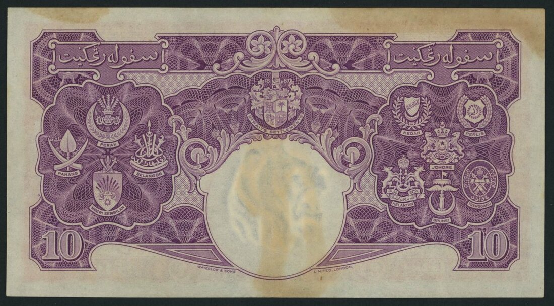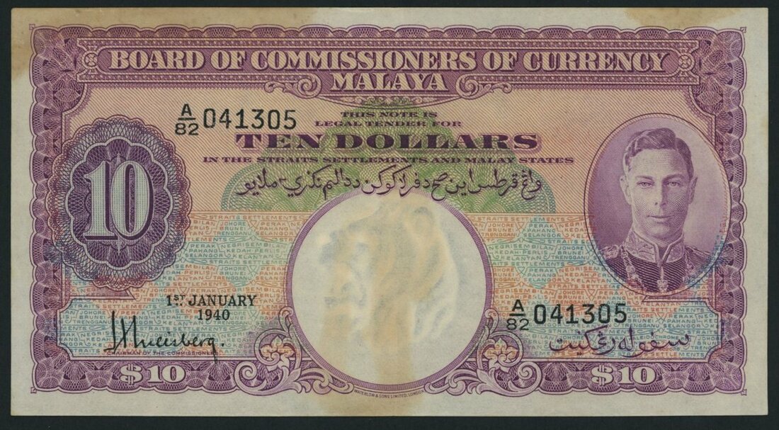 Board of Commissioners of Currency, Malaya, $10, 1st January 1940, serial number A/82 041305, (Pick 1), staining and residue obverse and reverse otherwise very fine