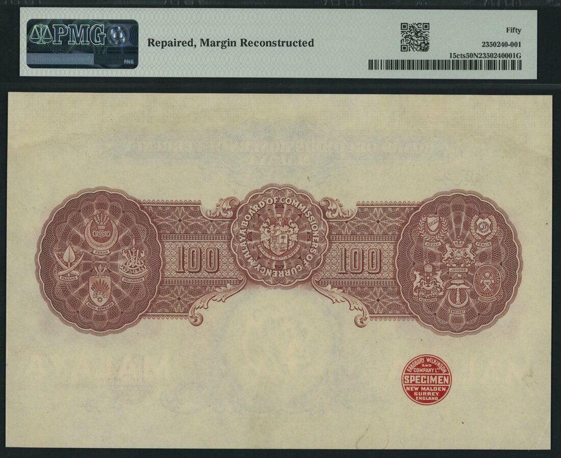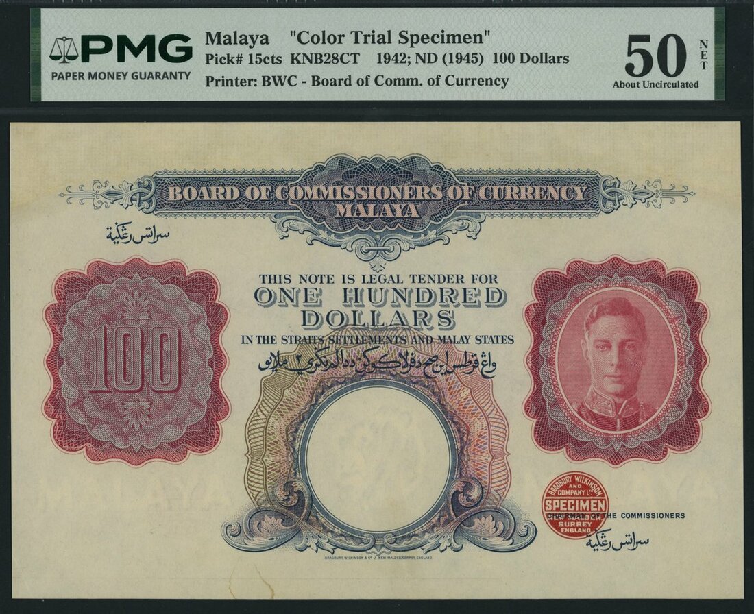 (x) Board of Commissioners of Currency, Malaya, colour trial specimen 100 Dollars, ND (1942), (Pick 15cts), in PMG holder 50 NET About Uncirculated, repaired, margin reconstructed, only 4 notes in higher grades on PMG census, beautiful and rare