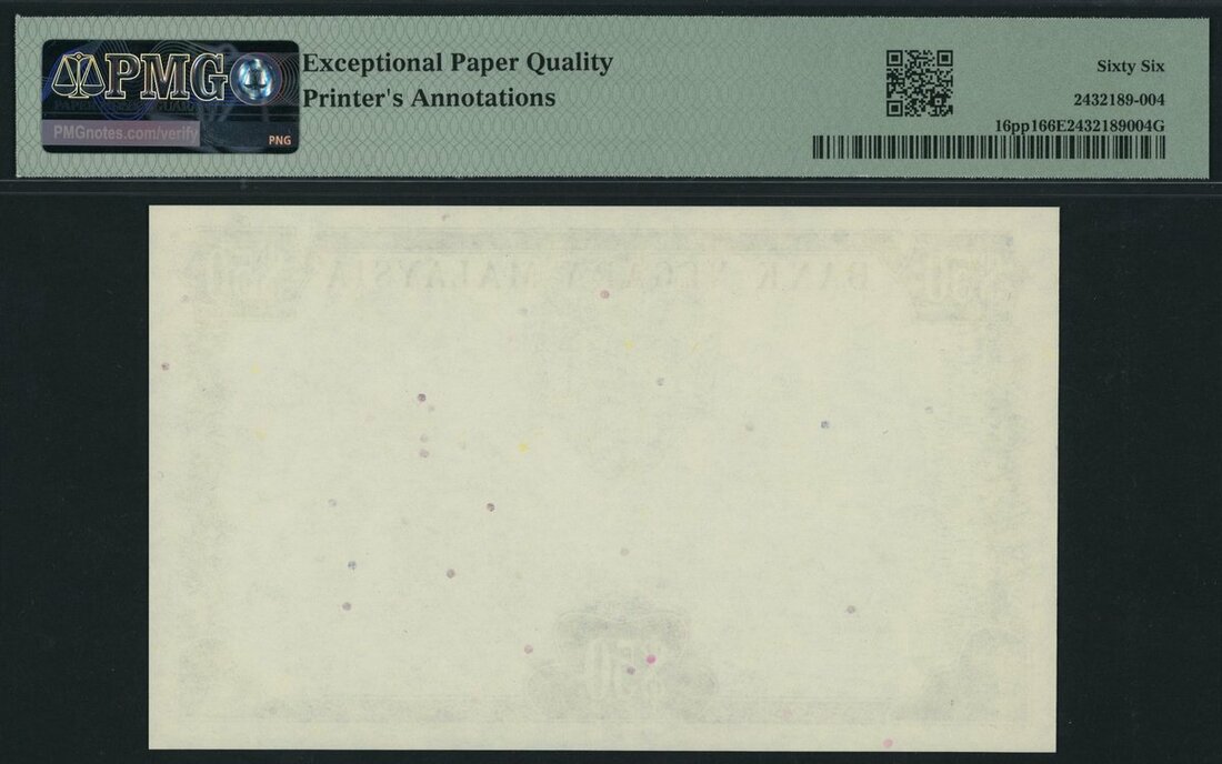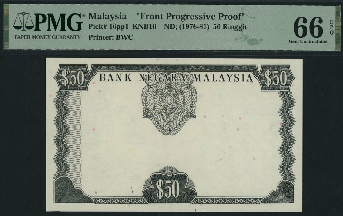 (x) Malaysia, front progressive proof, 50 Ringgit, ND (1976-81), no serial number, (Pick 16pp1, KNB16), in PMG holder 66 EPQ Gem Uncirculated, printer's annotations