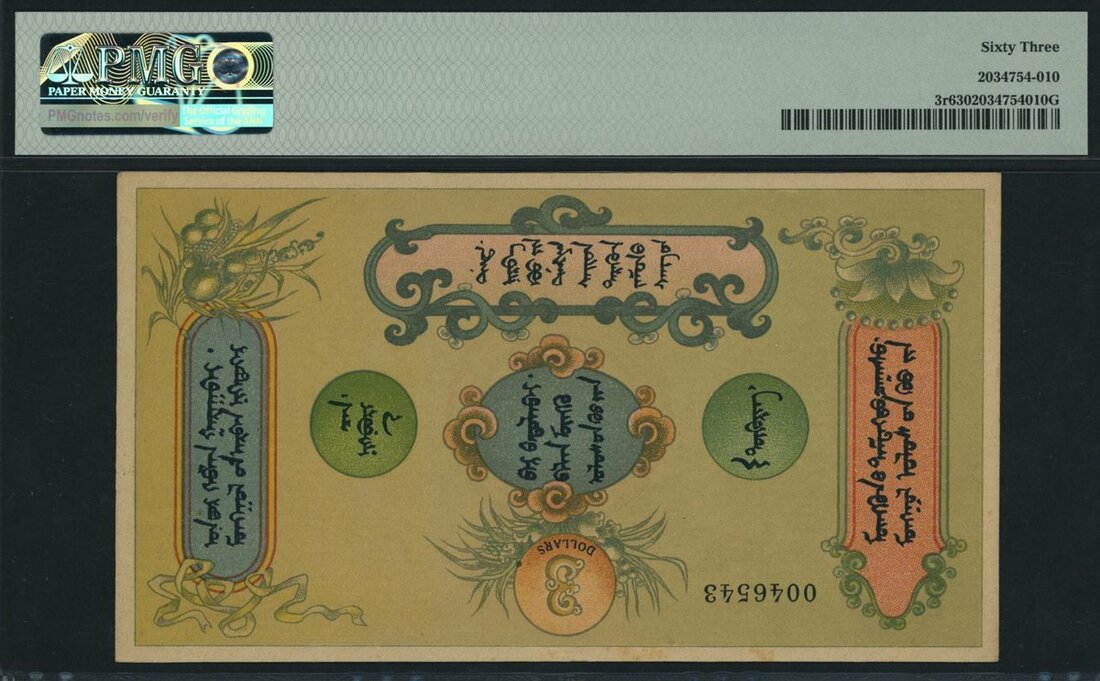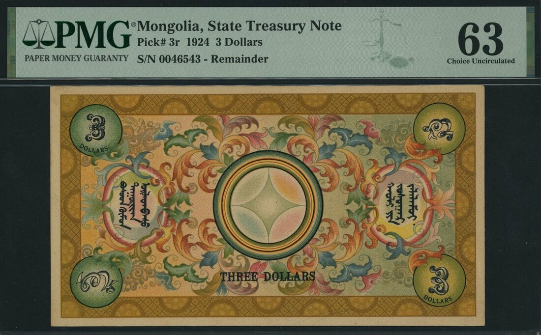 State Treasury Note, Mongolia, remainder 3 Dollars, 1924, serial number 0046543, (Pick 3r), in PMG holder 63 Choice Uncirculated, scarce and popular