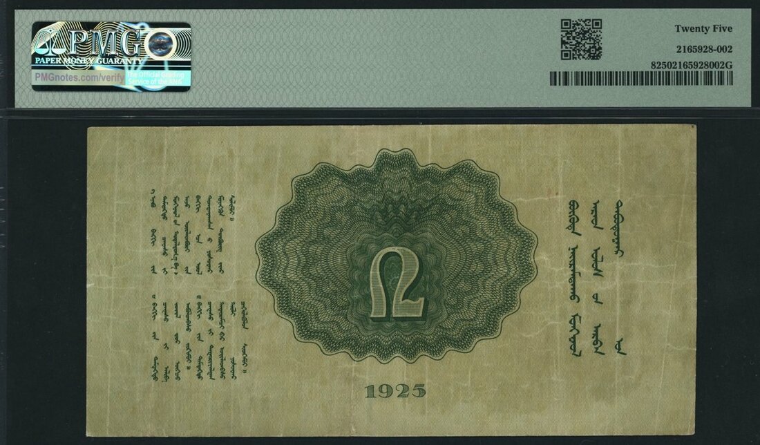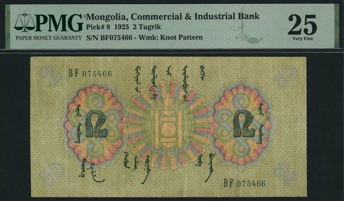 (x) Commercial and Industrial Bank, Mongolia, 2 Tugrik, 1925, serial number BF 075466, (Pick 8, BNB 202), in PMG holder 25 Very Fine, only 3 notes in higher grade on the PMG census