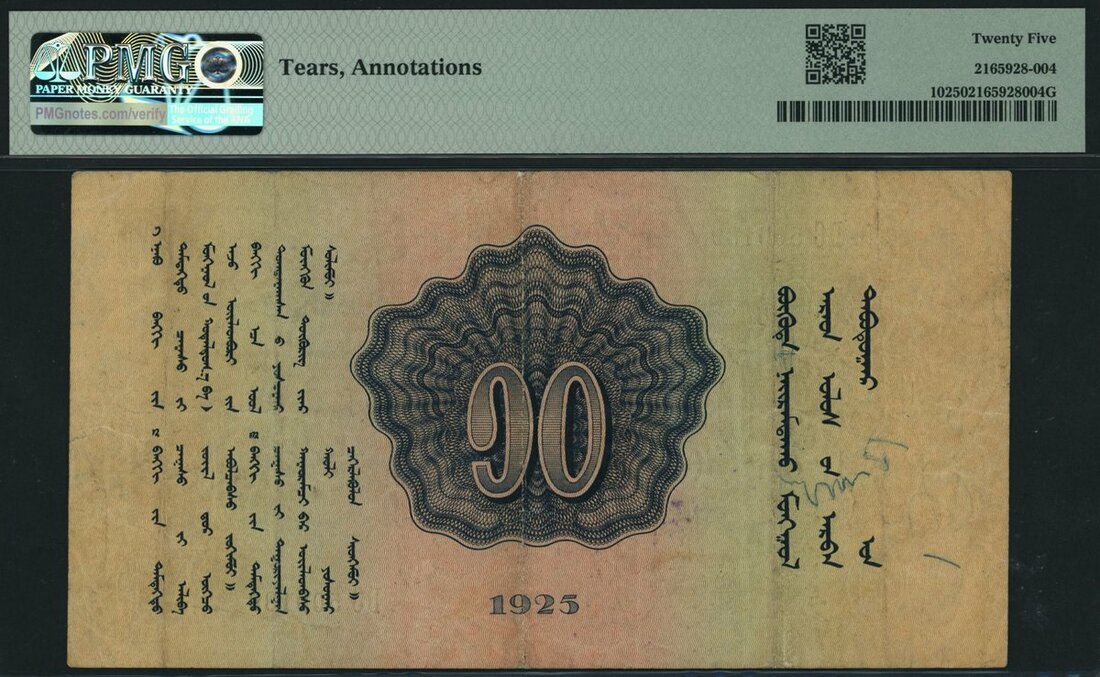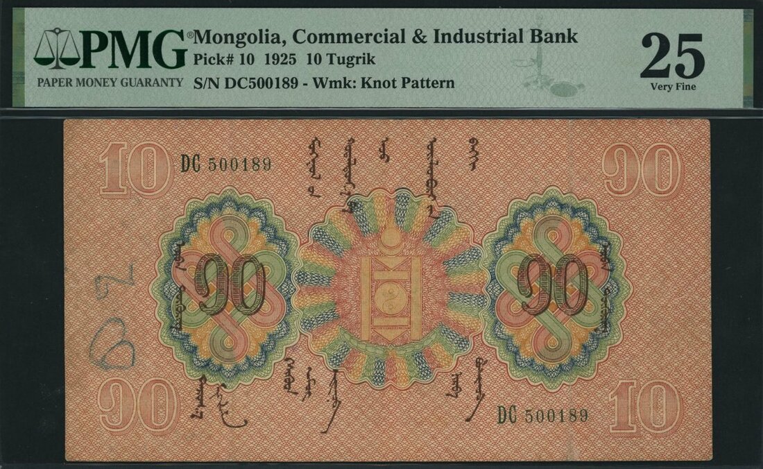 (x) Commercial and Industrial Bank, Mongolia, 10 Tugrik, 1925, serial number DC 500189, (Pick 10, BNB 204), in PMG holder 25 Very Fine, tears, annotations, only 5 notes in higher grade on the PMG census