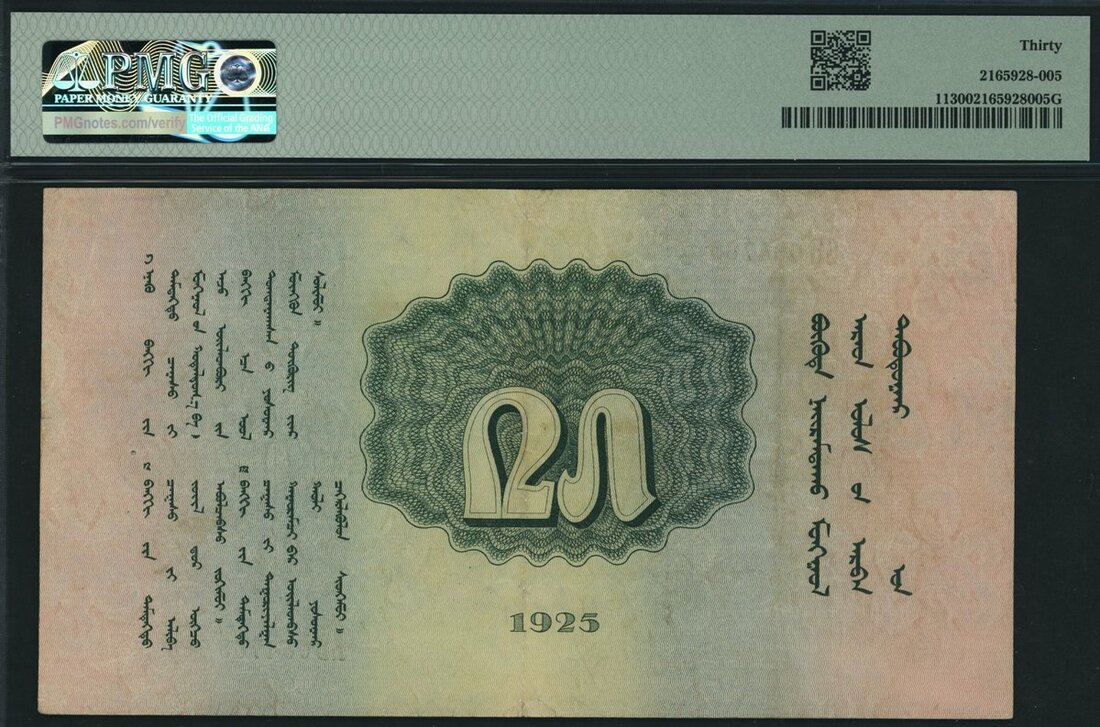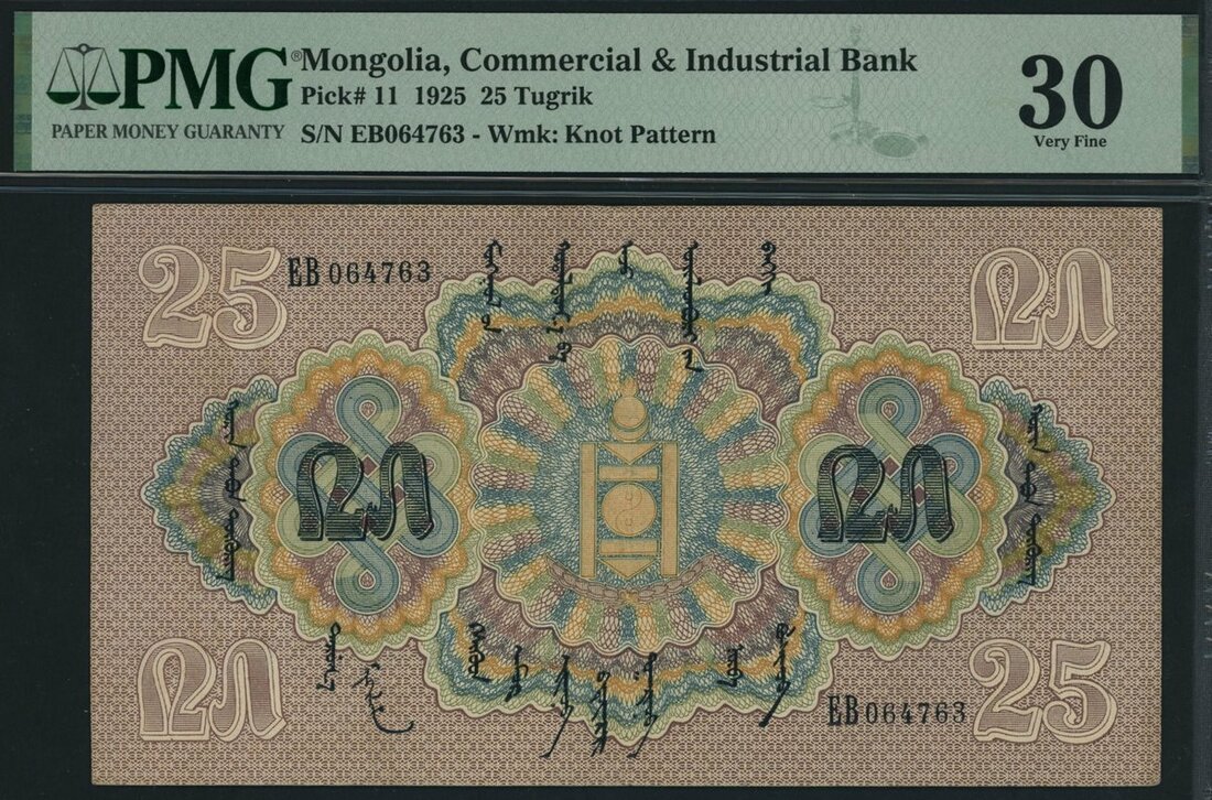 (x) Commercial and Industrial Bank, Mongolia, 25 Tugrik, 1925, serial number EB 064763, (Pick 11, BNB 205), in PMG holder 30 Very Fine, only 9 notes in higher grade on the PMG census