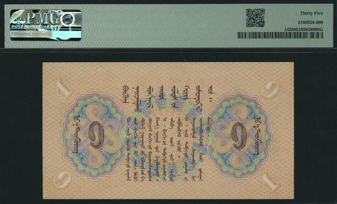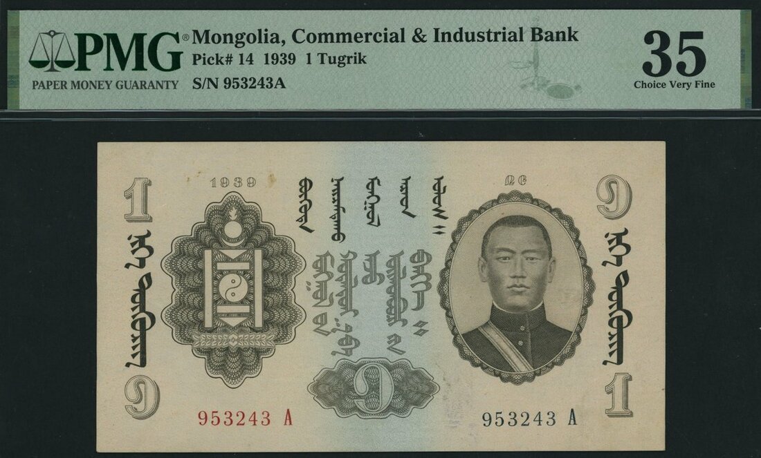 (x) Commercial and Industrial Bank, Mongolia, 1 Tugrik, 1939, serial number 953243 A, (Pick 14, BNB 208), in PMG holder 35 Choice Very Fine