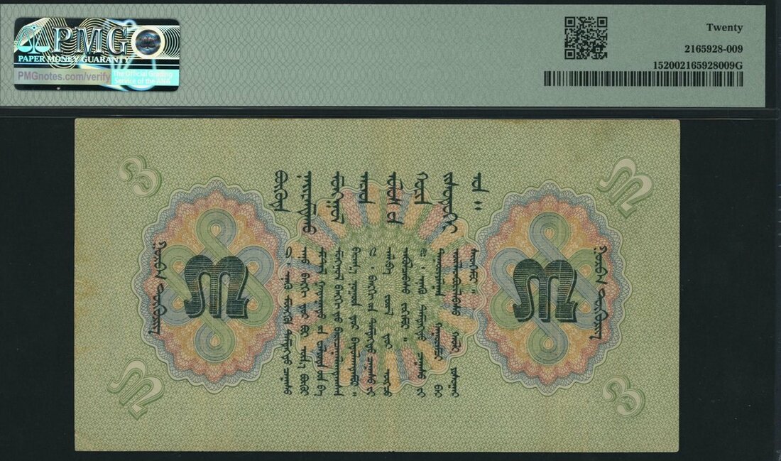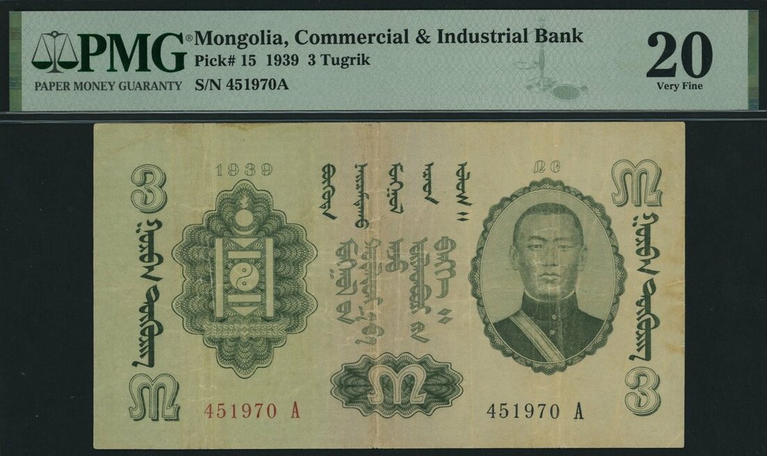 (x) Commercial and Industrial Bank, Mongolia, 3 Tugrik, 1939, serial number 451970 A, (Pick 15, BNB 209), in PMG holder 20 Very Fine, only 1 note in higher grade on PMG census