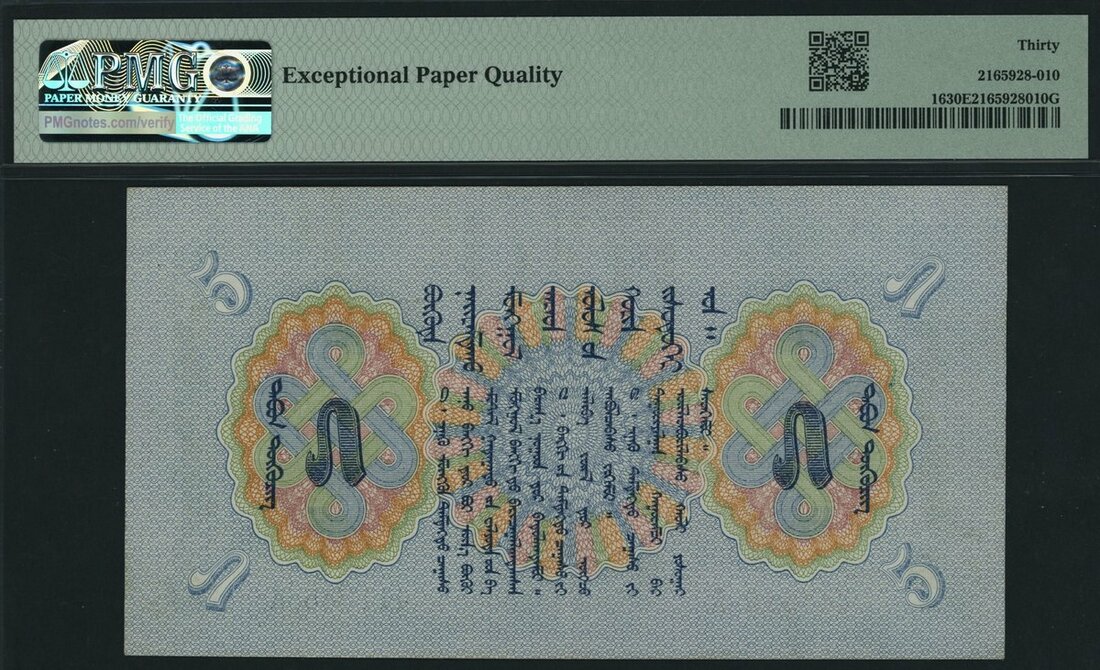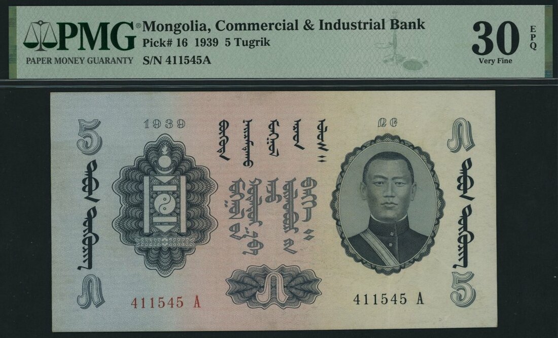 (x) Commercial and Industrial Bank, Mongolia, 5 Tugrik, 1939, serial number 411545 A, (Pick 16, BNB 210), in PMG holder 30 EPQ Very Fine, only 4 notes in higher grade on PMG census