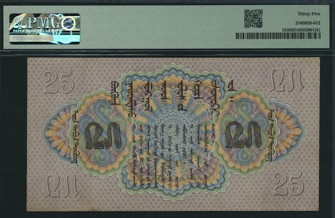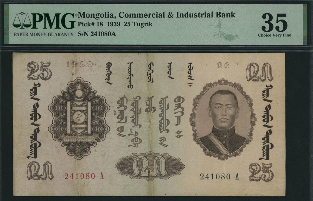 (x) Commercial and Industrial Bank, Mongolia, *TOP POP* 25 Tugrik, 1939, serial number 241080 A, (Pick 18, BNB 212), in PMG holder 35 Choice Very Fine, the Single Finest graded for the type on PMG census